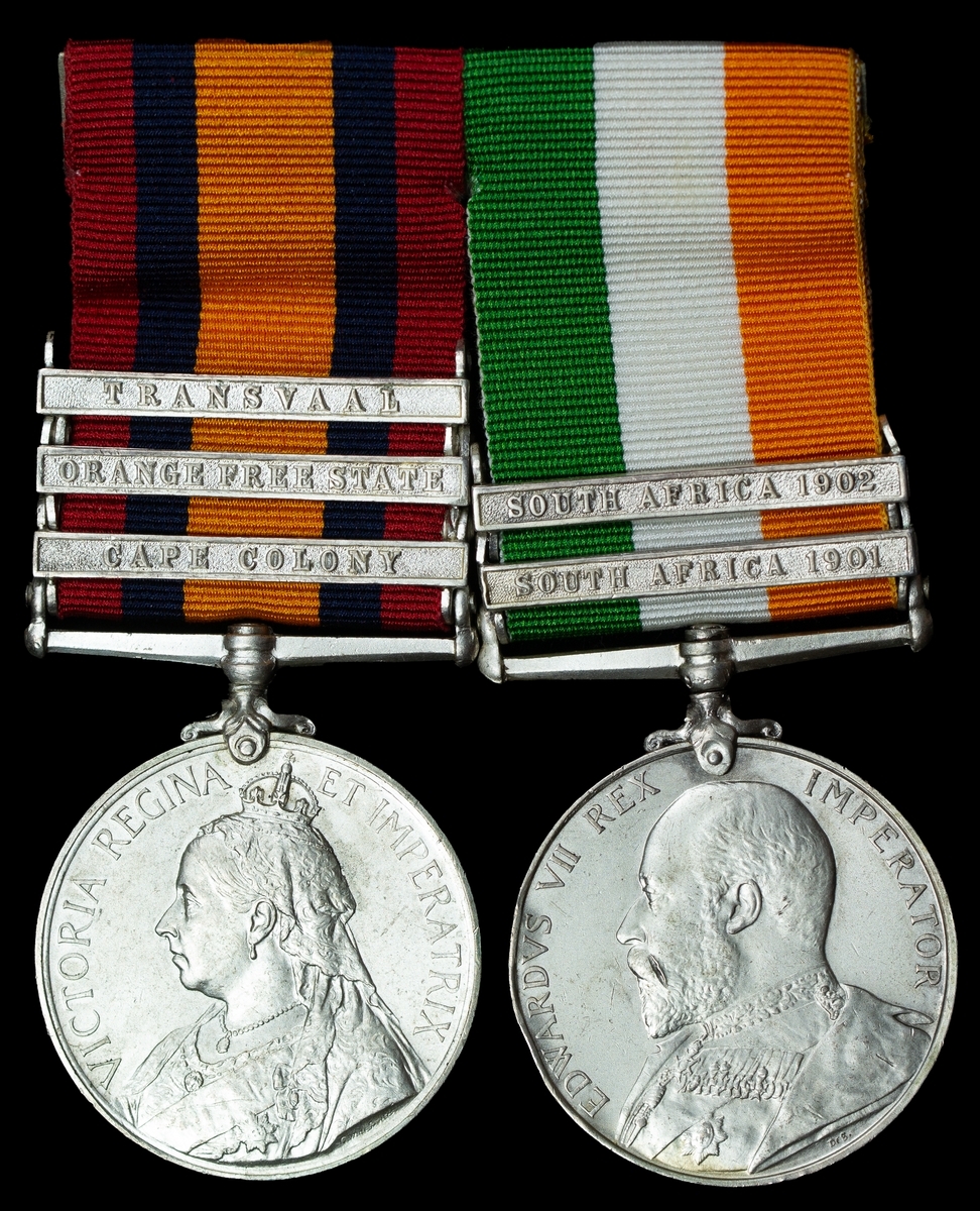 Queen's South Africa 1899-1902, 3 clasps, Cape Colony, Orange Free State, Transvaal (252 Serjt. D. McKerrell. Driscoll's Scts.); King's South Africa 1901-02, 2 clasps, South Africa 1901, South Africa 1902 (252 Serjt: D. McKerrell. Driscoll's Scouts.), mounted for display, a couple of light edge bruises otherwise very fine (2)