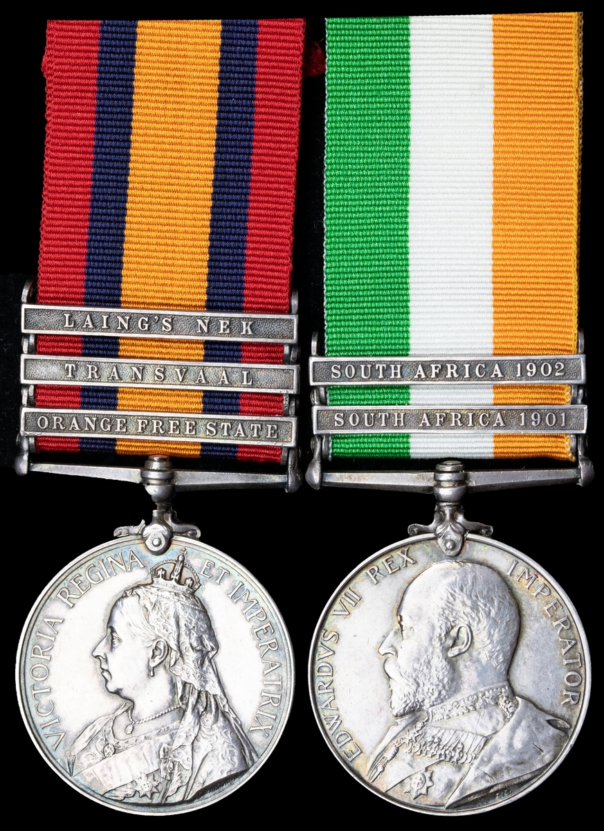 Queen's South Africa 1899-1902, 3 clasps, Orange Free State, Transvaal, Laing's Nek (3576 Pte P. Winterborn. 19th Hussars.); King's South Africa 1901-02, 2 clasps, South Africa 1901, South Africa 1902 (3576 Pte P. R. Winterborne. 19th Hussars.), note different spelling on the last, very fine