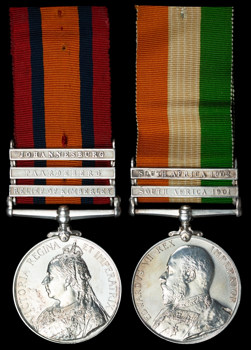 Queen’s South Africa 1899-1902, 3 clasps, Relief of Kimberley, Paardeberg, Johannesburg (5427 Pte. A. West, 2nd Shropshire Lt. Infy.); King’s South Africa 1901-02, 2 clasps, South Africa 1901, South Africa 1902 (5427 Pte. A. West. Shrops. L.I.), extremely fine (2)
