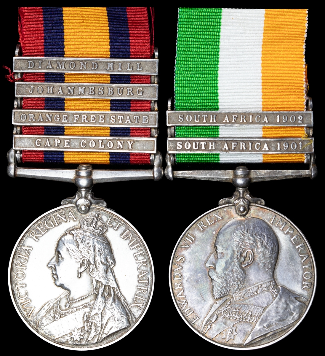 Queen's South Africa 1899-1902, 4 clasps, Cape Colony, Orange Free State, Johannesburg, Diamond Hill (5096. Pte. W. Lyons. 6/Drgns.); King's South Africa 1901-1902, 2 clasps, South Africa 1901, South Africa 1902 (5096 Pte W. Lyons. Innis: Drgns:), light contact marks, otherwise very fine (2)