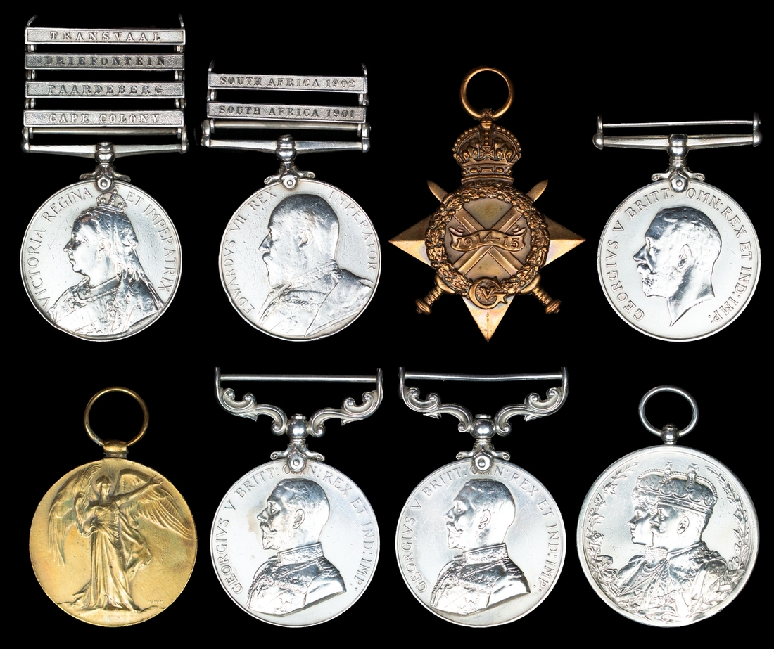 Queen's South Africa 1899-1902, 4 clasps, Cape Colony, Paardeberg, Driefontein, Transvaal (5189 Pte. W. Statham: 2nd Shropshire Lt. Infy.); King's South Africa 1900-1902, 2 clasp, South Africa 1901, South Africa 1902 (5189 Serjt: W. Statham. Shrops:L.I.); 1914-1915 Star (5189 C.S.Mjr. W. Statham. Shrops.L.I.); British War and Victory Medals (5189 W.O.Cl. 2. W. Statham. K.S.L.I.); Army Meritorious Service Medal, G.V.R. (5196 C.S.Mjr: W. Statham. 59/Coy M.G.C.); Army L.S. & G.C., G.V.R. (5196 W.O. Cl.II W. Statham. M.G.C.); Delhi Durbar 1911, engraved '5189 Sergt. W. Statham. King's Shropshire L.I.', heavy contact wear and edge bruises to first two, otherwise contact wear overall, very fine (8)
