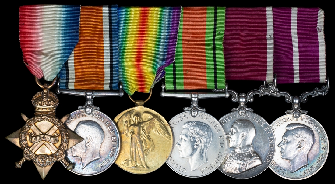 1914-15 Star (7293 C.Q.M. Sjt. F. Thompson. Shrops:L.I.); British War and Victory Medals (7293 A.W.O. Cl.2. F. Thompson. K.S.L.I.); Defence Medal 1939-45; Army L.S. & G.C., G.V.R. (4026129 W.O. Cl.I. F. Thompson. K.S.L.I.); Army Meritorious Service Medal, G.VI.R. (4026129 W.O. Cl. 1. F. D. Thomson. K.S.L.I.), the surname officially corrected, mounted as worn, light pitting, polished, very fine (6)