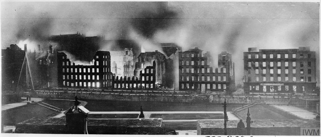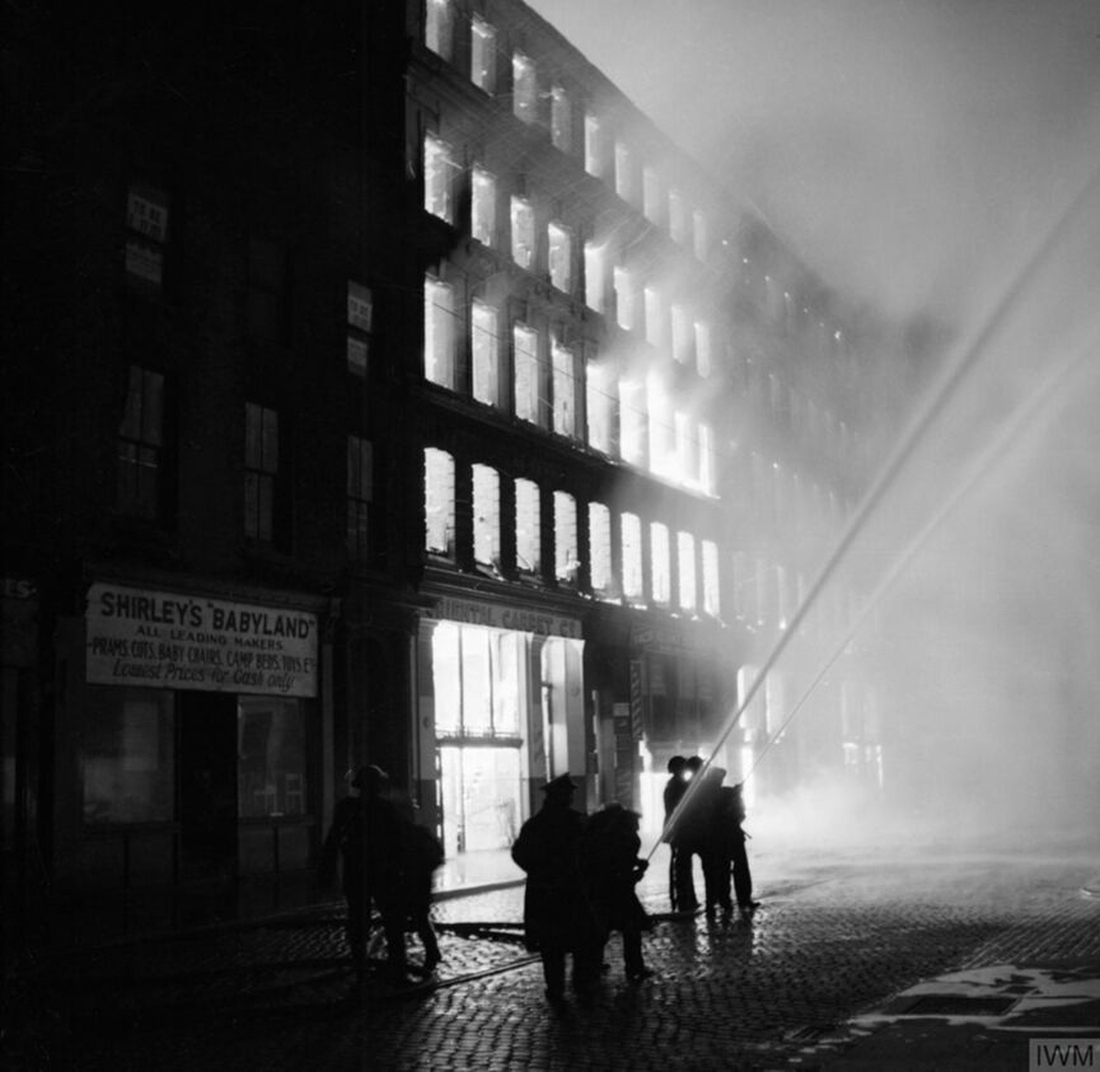 During the air raids on 22-24 December, 600 fires were started by incendiary bombs over the two nights. Blocks of commercial and warehouse premises – as shown in this photograph – were particularly badly hit, with many completely burnt out. Unfortunately, many of Manchester's 3,500 full and part-time fire fighters and Civil Defence workers had not returned from Liverpool where they had been sent several days before to help fight fires caused by air raids there. As a result of these raids [including others in September 1940], an estimated 684 people died and more than 2,000 were injured.'