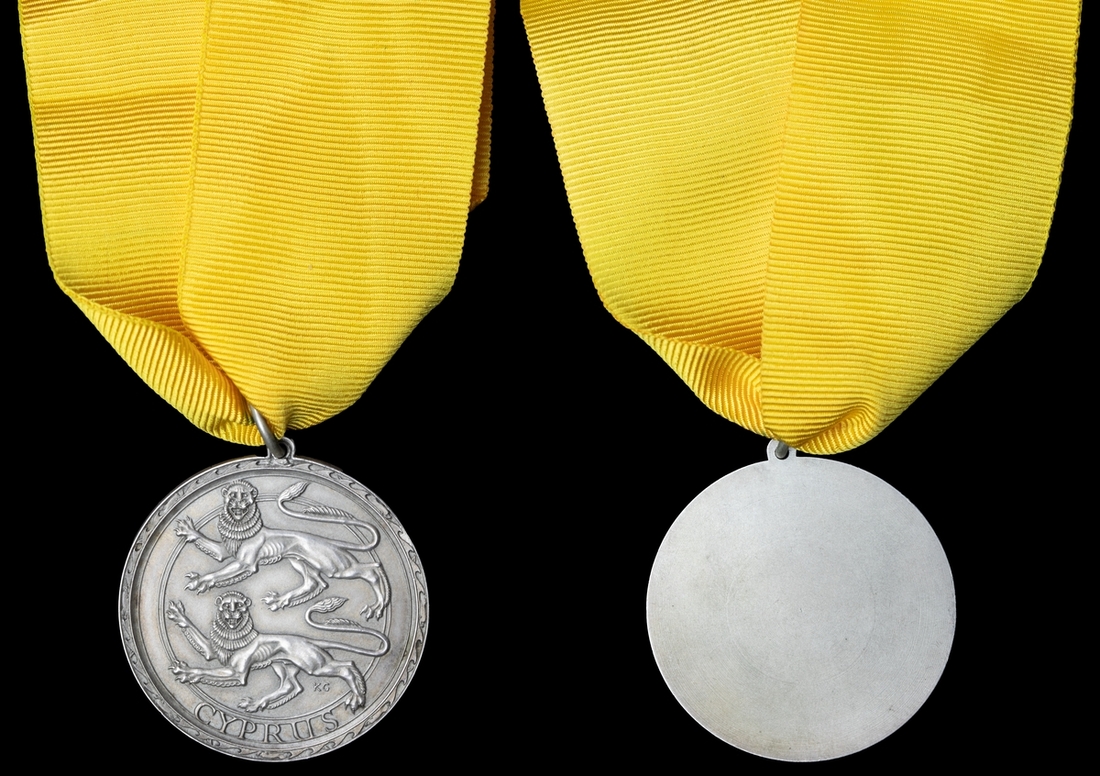 Badge of the Certificate of Honour for Cyprus, a silver uniface trial version of the G.VI.R. issue, 41.8mm, reverse side by Kruger Gray, two lions left regardant passant, CYPRUS below, superimposed on two concentric circles, one plain and one ornamental, fitted with integral loop for suspension, extremely fine