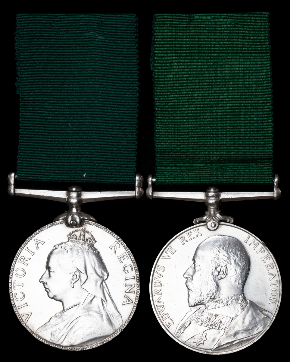 (x) Volunteer Force Long Service, E.VII.R. (1406 Pte G. Shelley. 2/V.B N. Staff. Regt); Volunteer Force Long Service, V.R., unnamed as issued, both very fine (2)