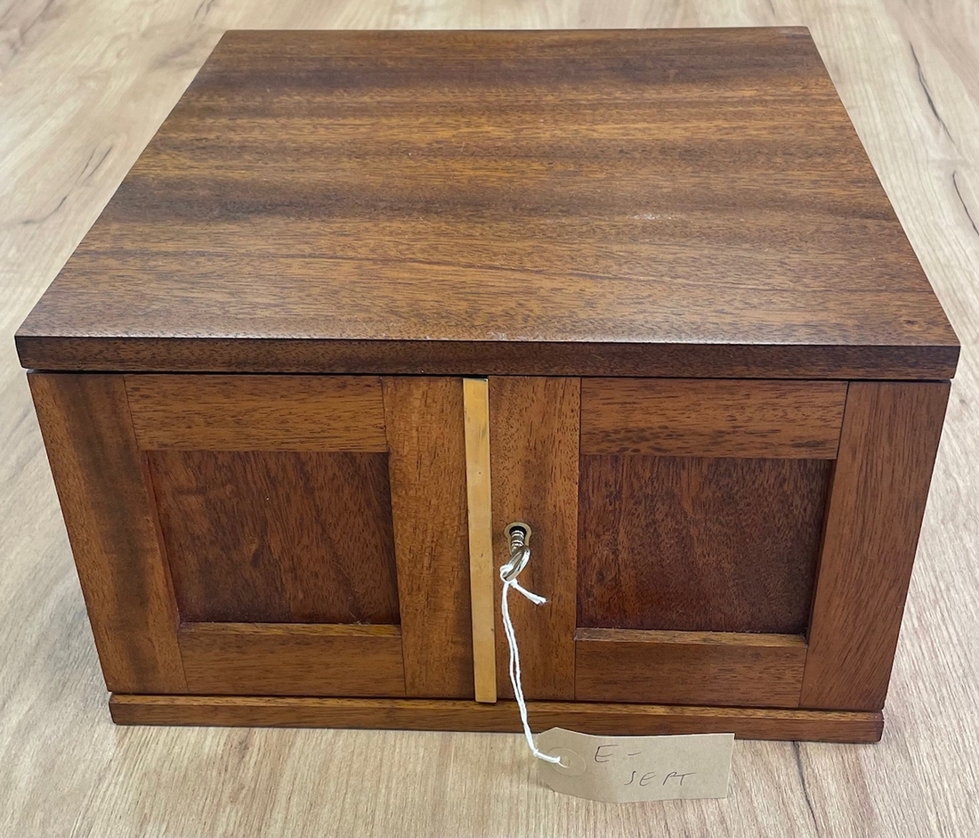 Made from mahogany, fitted with seven drawers and two doors to the front which are lockable, with two brass carry handles to the sides, made by Peter Nichols cabinet makers, 17.8x 29.6cm x 30.3cm, in very good usable condition