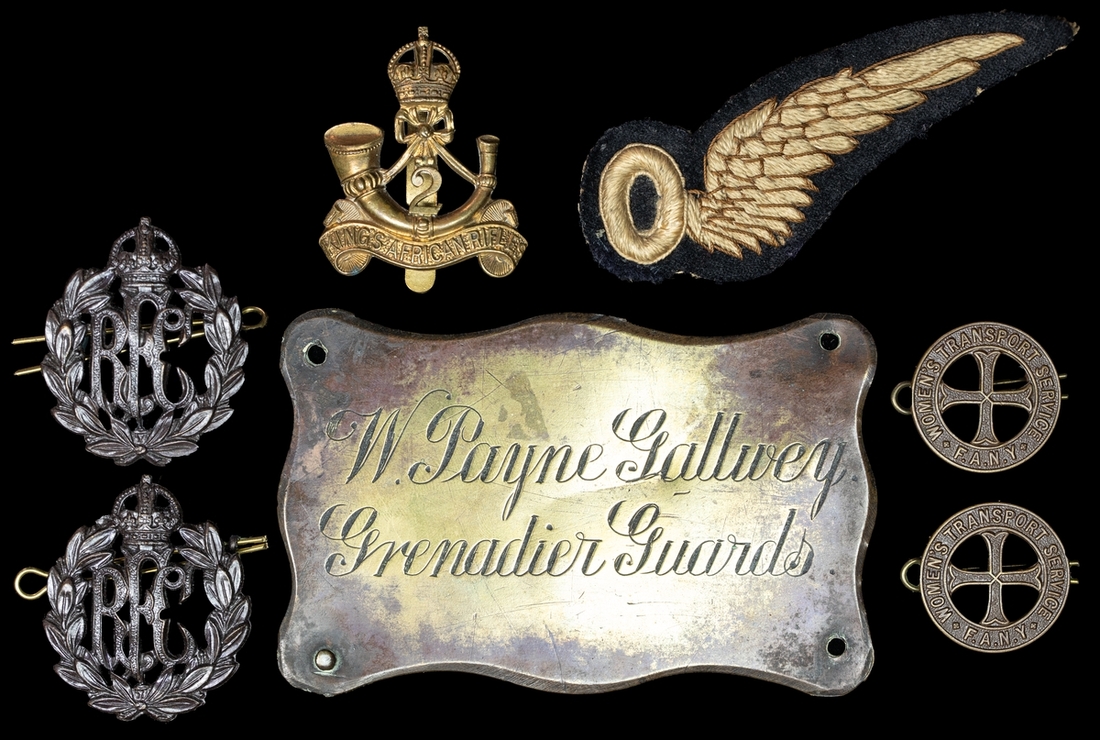 An assortment of military cap badges and associated ephemera, including Royal Flying Corps, King's African Rifles, First Aid Nursing Yeomanry, and County regiments (13), fob-style prize medals (4), an Observer's brevet, and brass plate from an officer's tin accoutrement trunk, engraved W. Payne Gallwey. Grenadier Guards., very fine