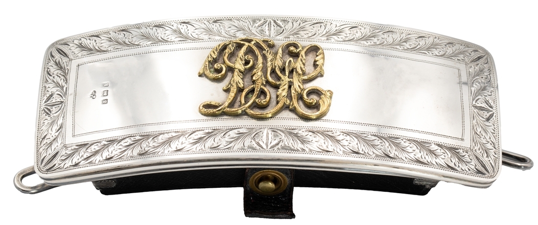 Derbyshire Yeomanry Cavalry silver-mounted cartouche pouch, hallmarks for Birmingham 1909, all fittings further hallmarked, applied gilt 'DYC' to front, Morocco leather and bullion thread, very fine