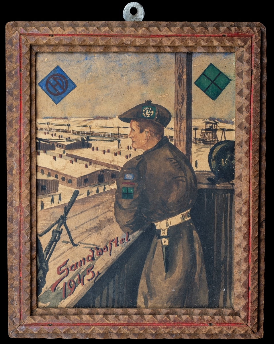 Watercolour on card, with period hand-made frame, depicting a solider of the Highland Division gazing across the liberated camp, inscribed 'SANDBOSTEL 1945', 167mm x 137mm overall, very fine and a moving period object