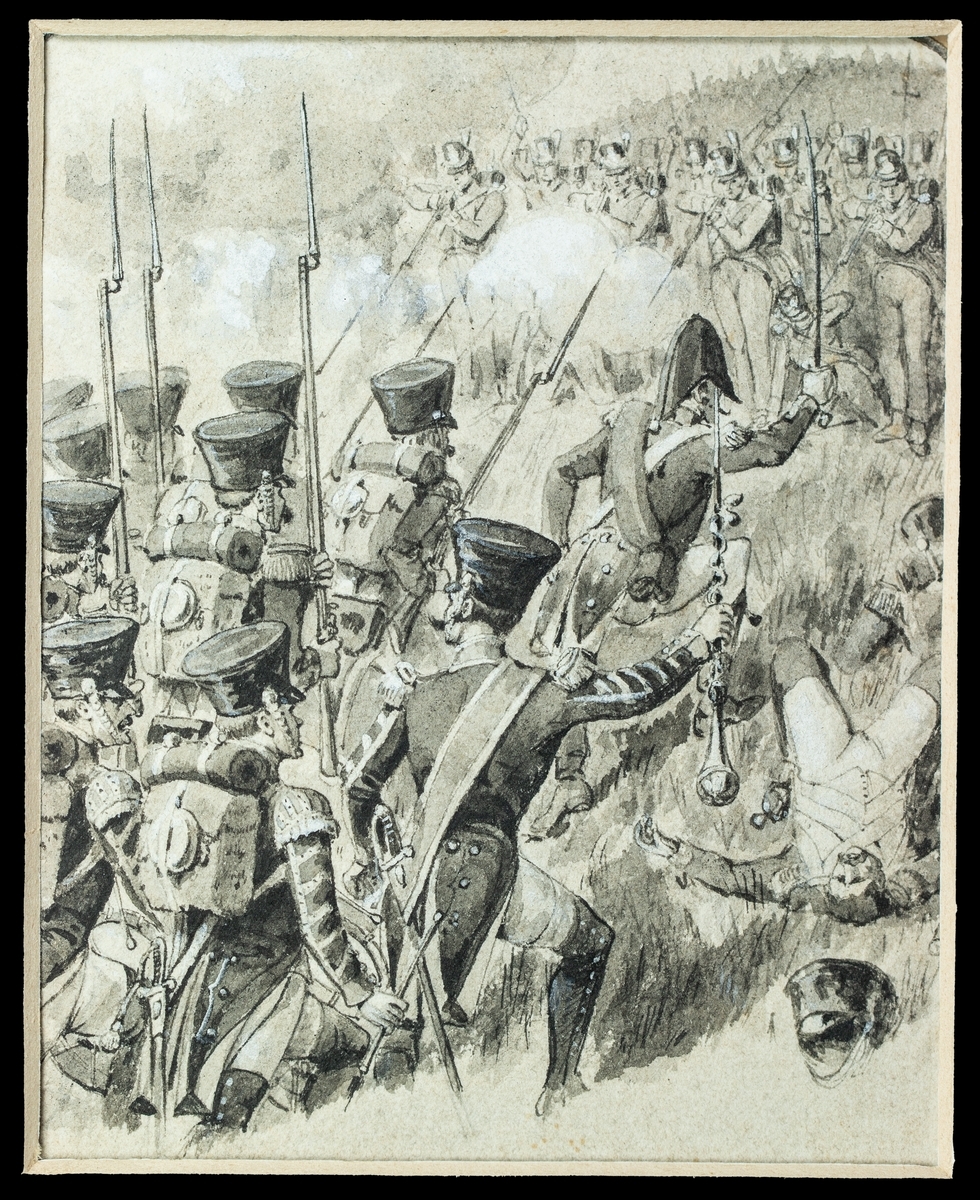 A mounted pen and ink picture by Richard Simkin depicting the French attack on the British at Talleucusa, good very fine