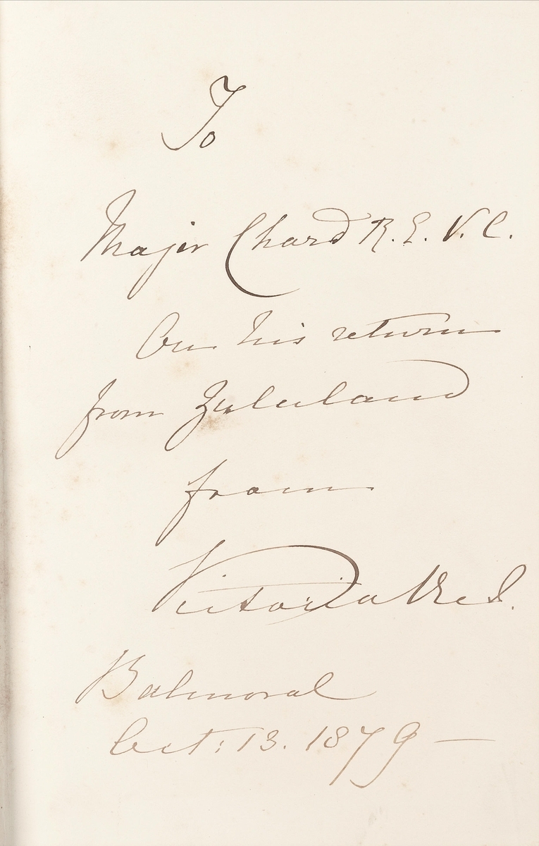 The important presentation copy of Leaves from the Journal of Our Life in the Highlands given by the author, Queen Victoria, to Major J. Chard V.C., Royal Engineers, upon his return to England from earning the Victoria Cross at Rorke's Drift, during their private audience at Balmoral Castle in October 1879