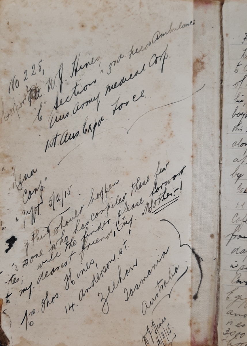 A pair of unpublished diaries written by Corporal W. J. Hines, 3rd Field Ambulance, Australian Army Medical Corps, later Lieutenant 15th Battalion, Australian Imperial Force