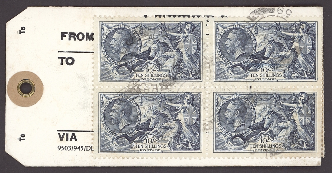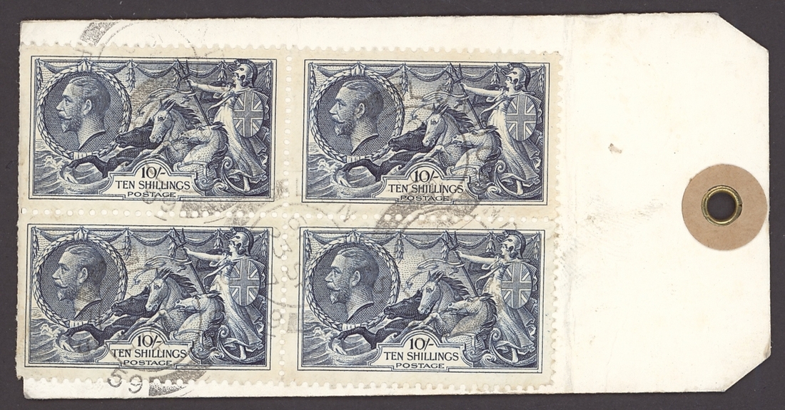 10/-indigo, block of eight (4 x 2), wrapped around parcel tag (blocks of four on either side), necessary creased perfs., fine and an unusual multiple. S.G. 452