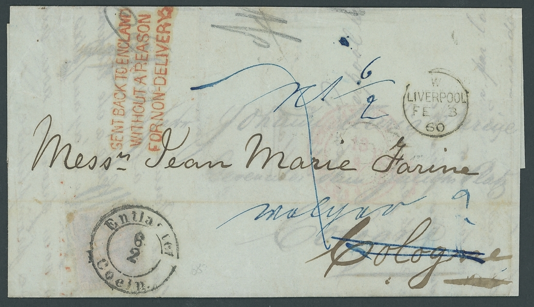 1860 (3 Feb.) entire unfranked from Liverpool addressed to Cologne, Germany arrived (6.2) undelivered and returned to sender showing sent back to England without a reason for non-delivery, on arrival the entire was turn out, franked with 1d. red and re-shipped to Germany (10.3) and finally delivered (13.3). Part of the internal letter cut out not detracting from the overall appearance. A fascinating piece of postal history.