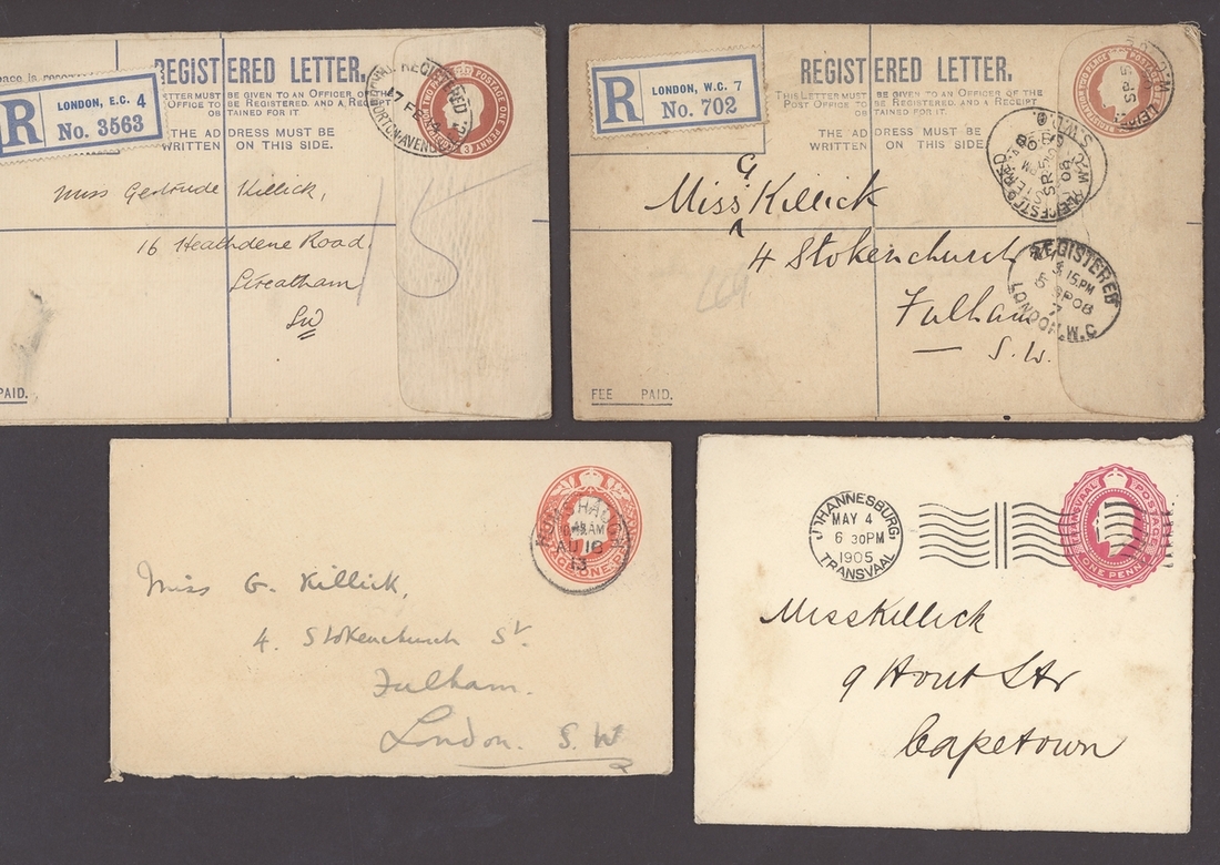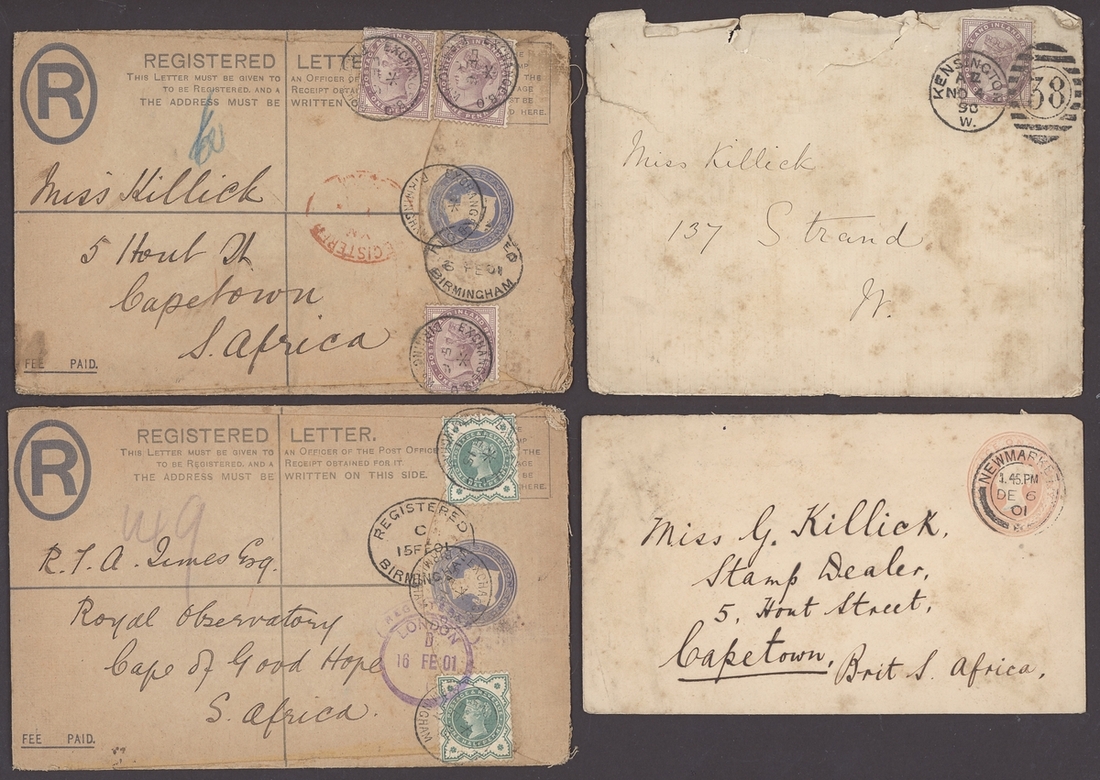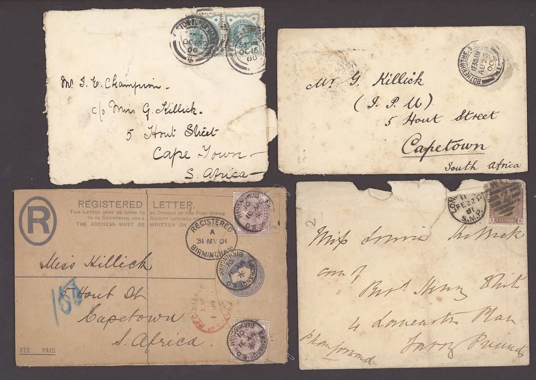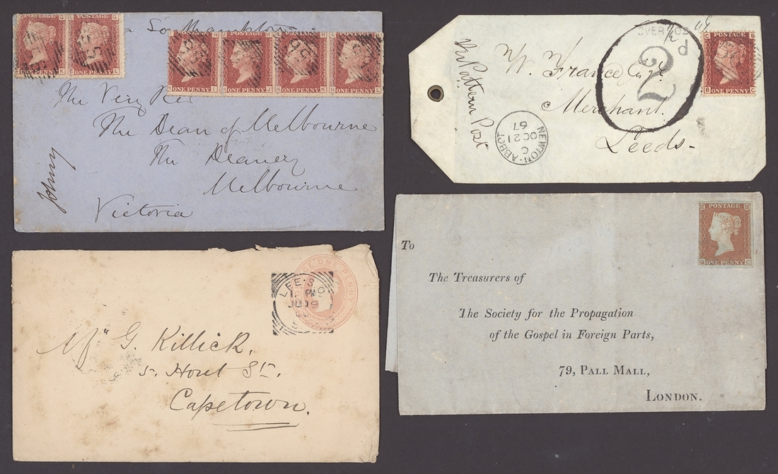 1854-1923, selection of nineteen items, including 1854 printed "Society for the Propagation of the Gospel in Foreign Parts" entire franked imperf. 1d. uncancelled, 1867 Parcel tag franked 1d. and with "2d" Postage Due handstamp, 1870 envelope to Melbourne franked 1d. (6), 1895 envelope to H.M.S "Cordelia" franked 2½d. and addressed in the hand of the Duke of York (later King George V), 1901 2d. Registered envelope to Cape Town additionally franked ½d. (2), l1923 stampless envelope Registered to Cecil Harcourt Smith and addressed in the hand of Queen Mary, etc., mixed condition but an interesting group
