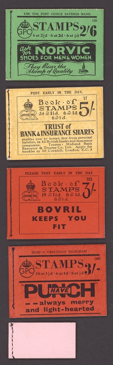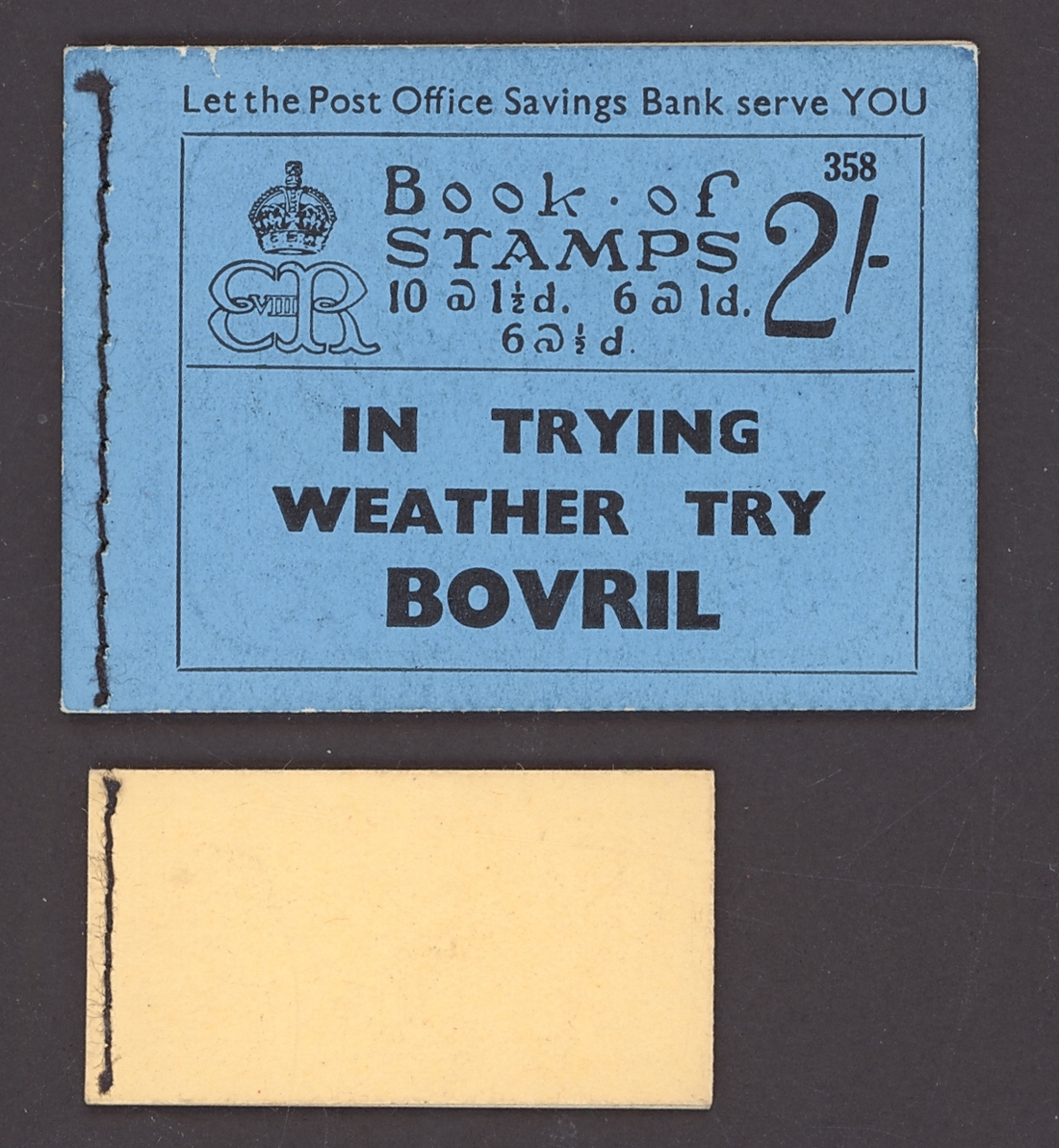 A group of Great Britain KEVIII and KGVI complete booklets (7) including 2/6d. green cover (BD16), 3/- red cover (BD 22), 2/- blue cover (BC 2), 3/- red cover (BC3), 5/- buff cover (BC 4), etc. fine. S.G. cat value £2,200+