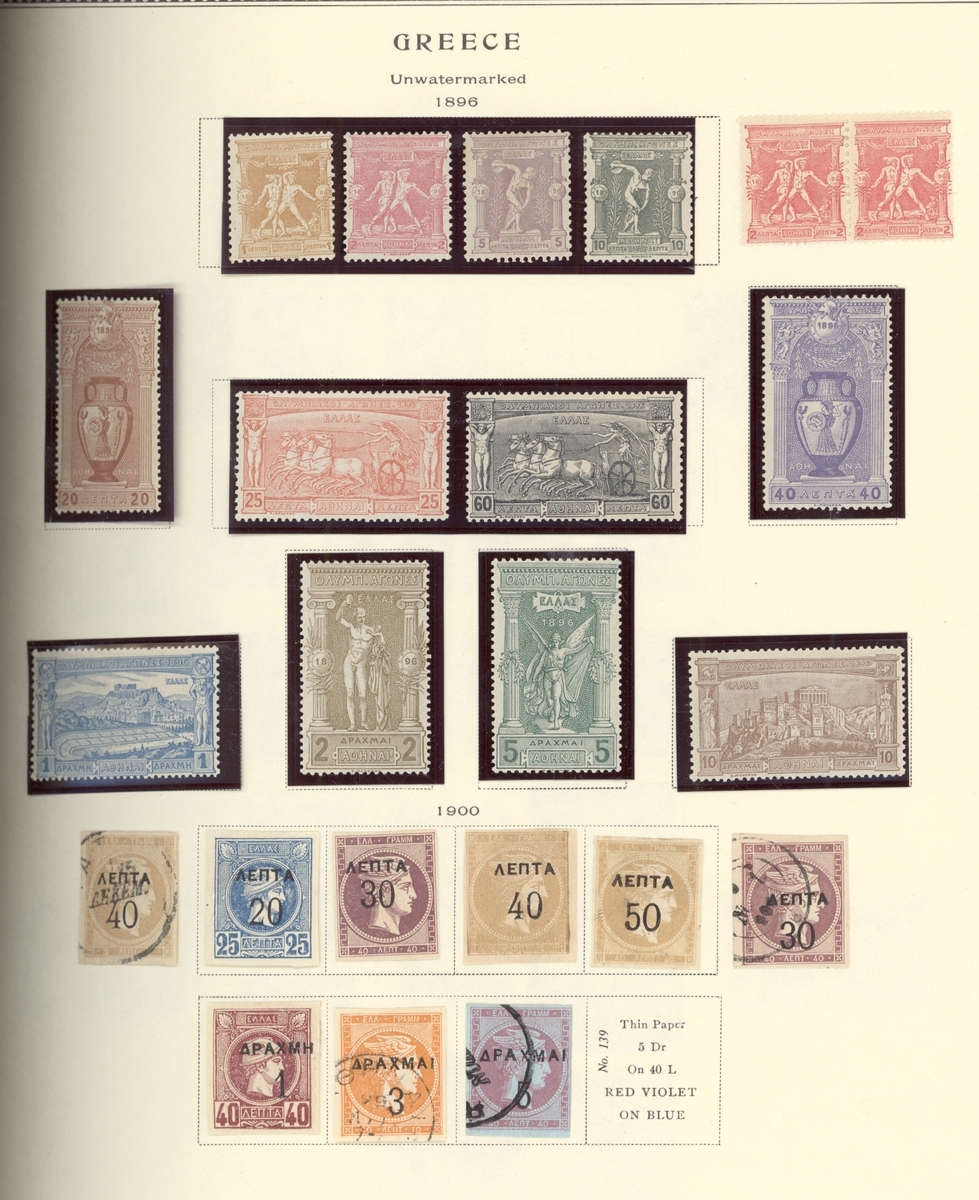 Mint and used Collection housed in a green "Scott" album, issues to 1980, including a range of large and small Hermes head issues, 1896 Olympics (an exceptionally fine and fresh set), 1900 surcharges with Olympics set of four, 1902 AM set, 1906 Olympics, 1911-21 engraved to 25d., 1913-23 Litho to 25d., 1916 Venezelist set, 1923 10d. on 10d. (APS Certificate (1995), 1922 overprints on Crete with 5d. on 5d. (APS Certificate 1991), 1927 with values to 25d. (both printings), 1930 Centenary, 1933 Republic 50d., 75d. and 100d., 1939 Ionian Islands, 1940 Youth Postage and Air1951 Reconstruction, and a very good range of later issues with many unmounted mint, covers with 1933 Aeroespresso set on first day cover, Postahe Dues, Occupations, etc., chiefly finepversm tf