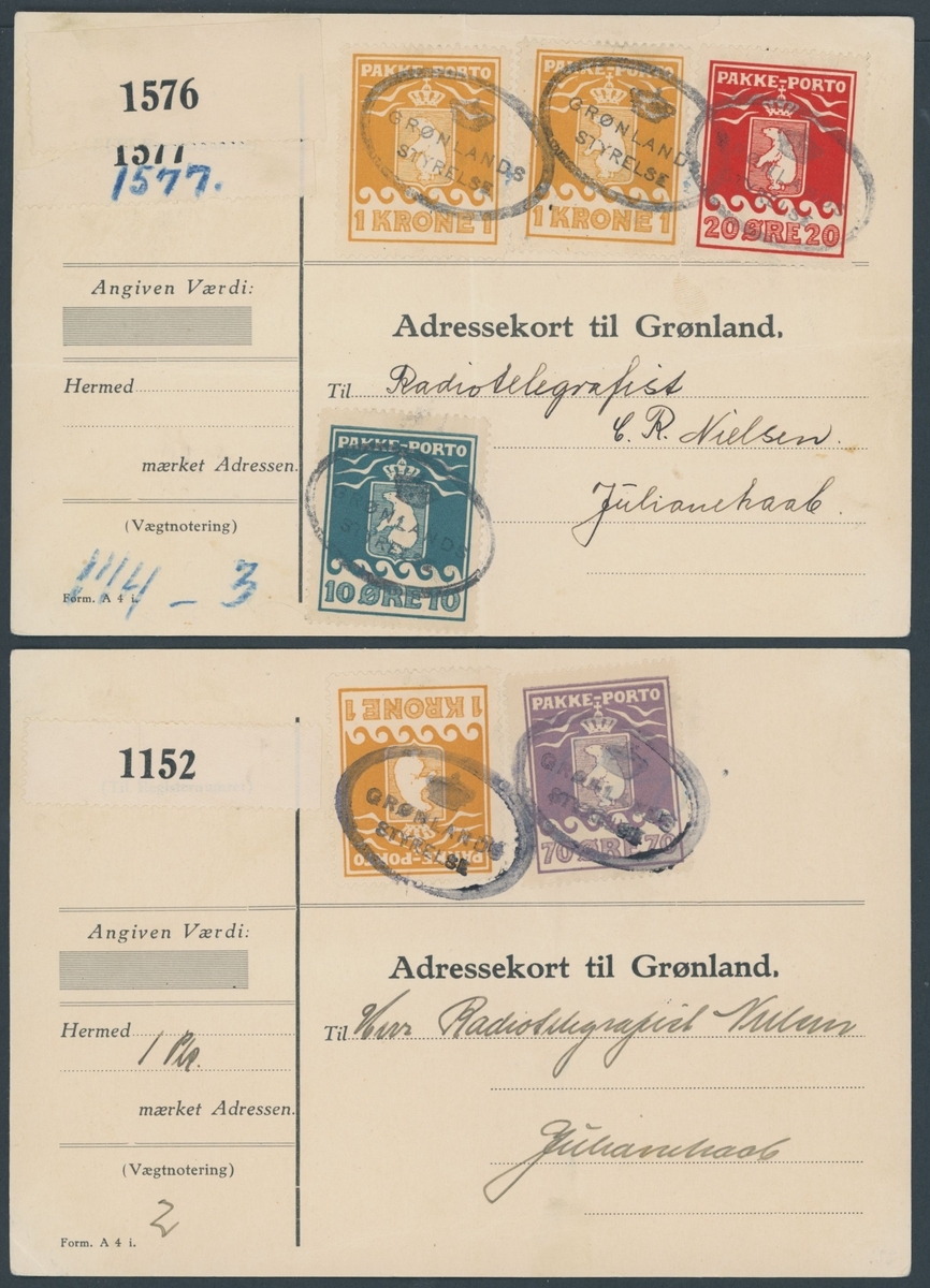 Two undated "Adressekort", the first (card creased) franked 10oe., 20oe. and 1k. (pair), the second franked 70oe. (creased) and 1k., oval