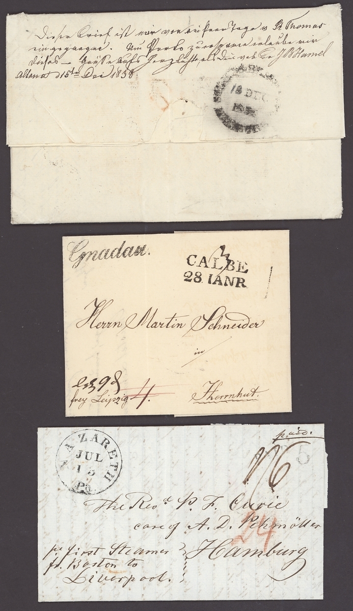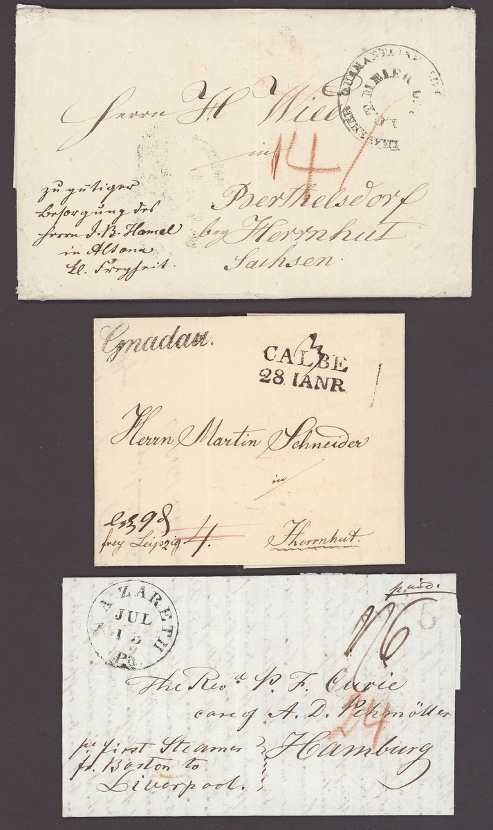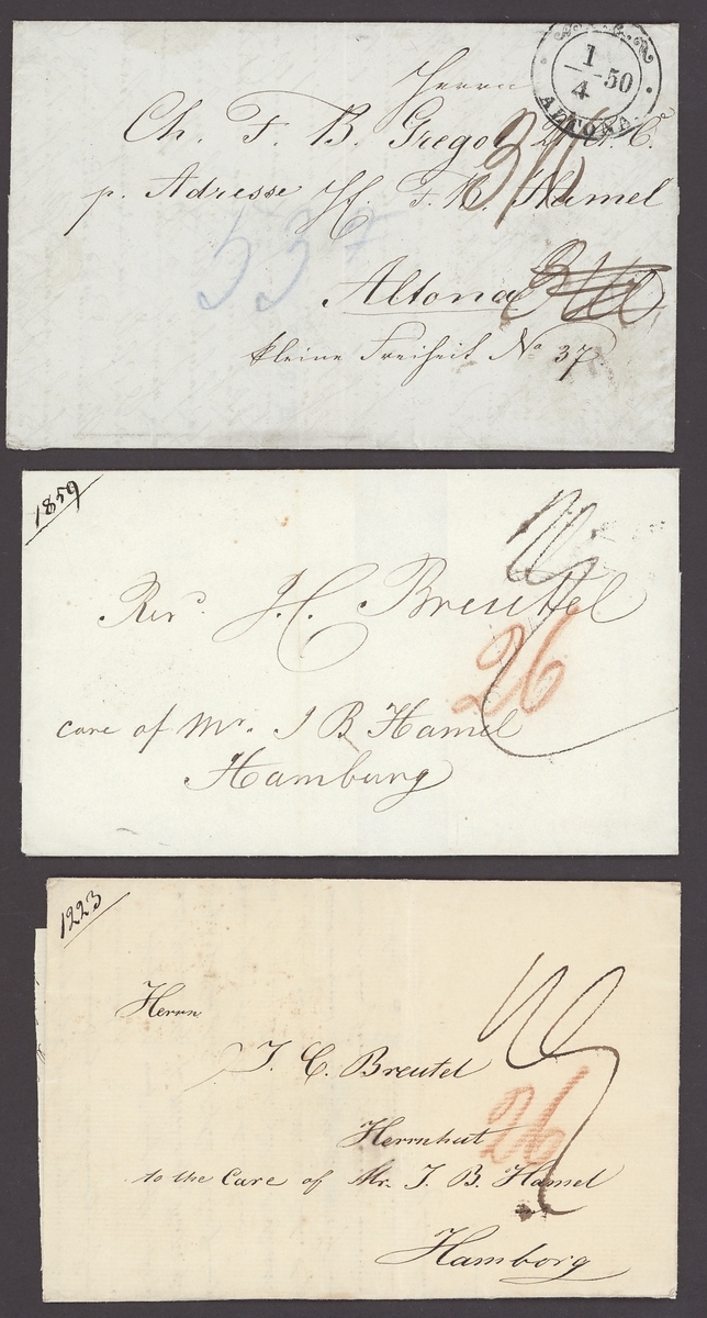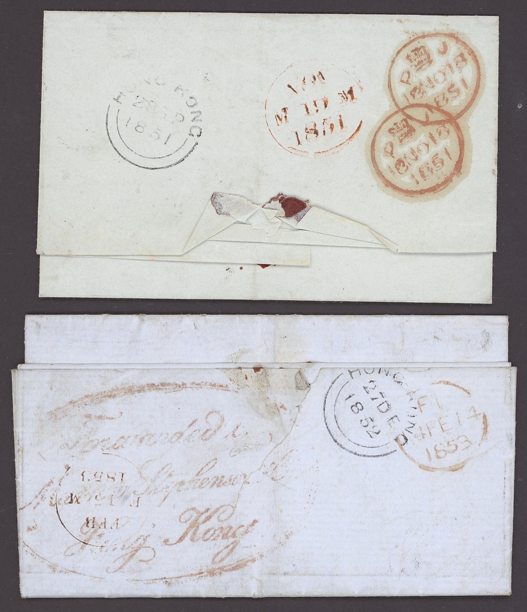 Selection of Hong Kong postal history: 1851 (28 Sept.), entire to Edinburgh with framed red script Munro Stephenson & Co forwarding agents handstamp on the front, transit and arrival markings on reverse, also 1852 (27 Dec.), entire letter to Edinburgh with large red script Forwarded by/Munro Stephenson & Co/Hong Kong (small tear), transit and arrival datestamps all on the reverse; fine. Also selection of German States Hamburg Incoming Mail: 1828-58, seven stampless entires/entire letters.