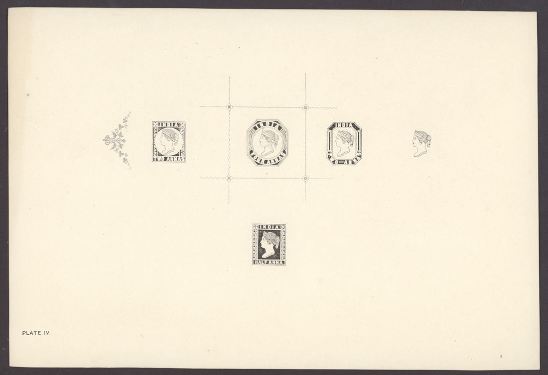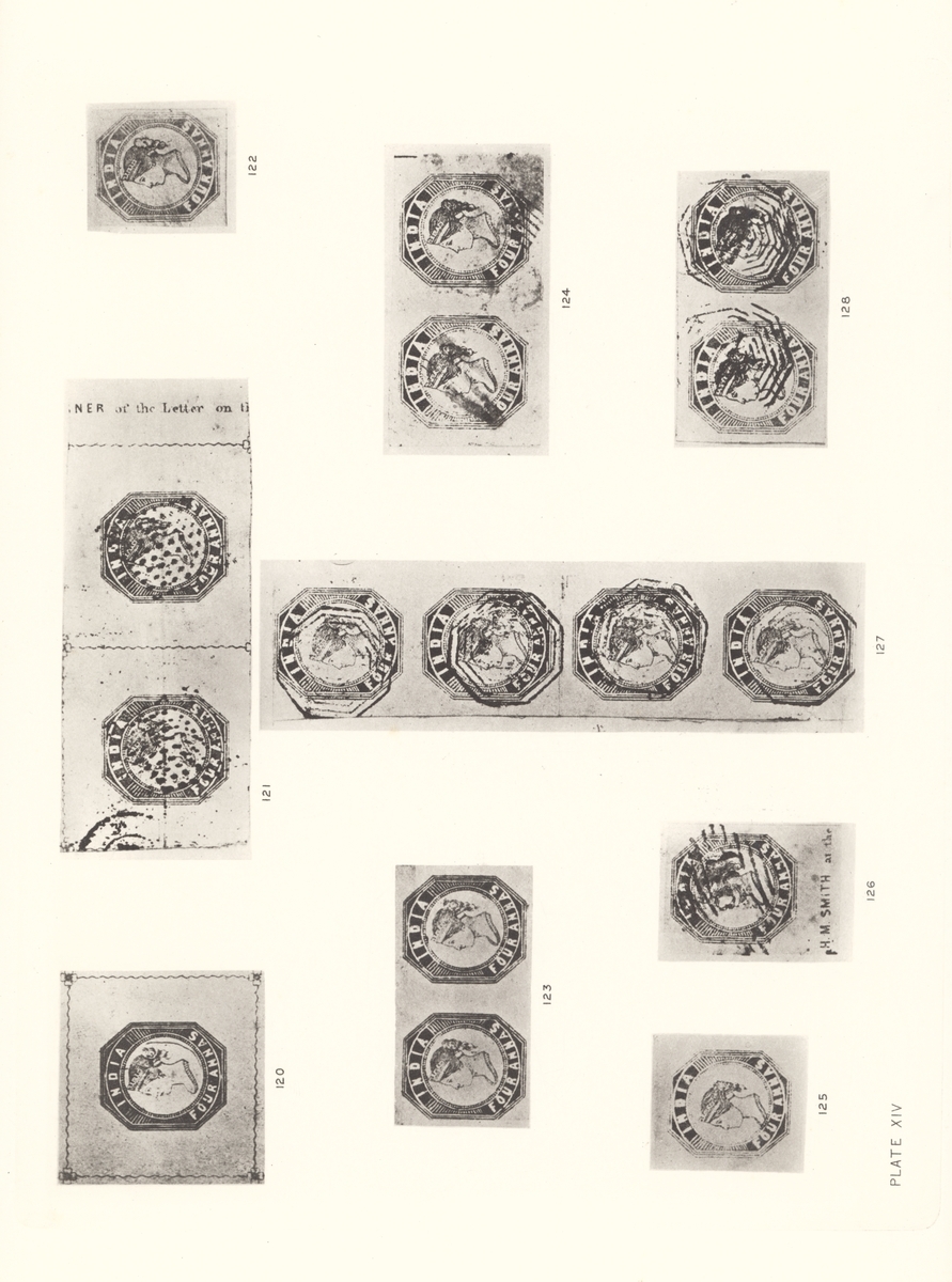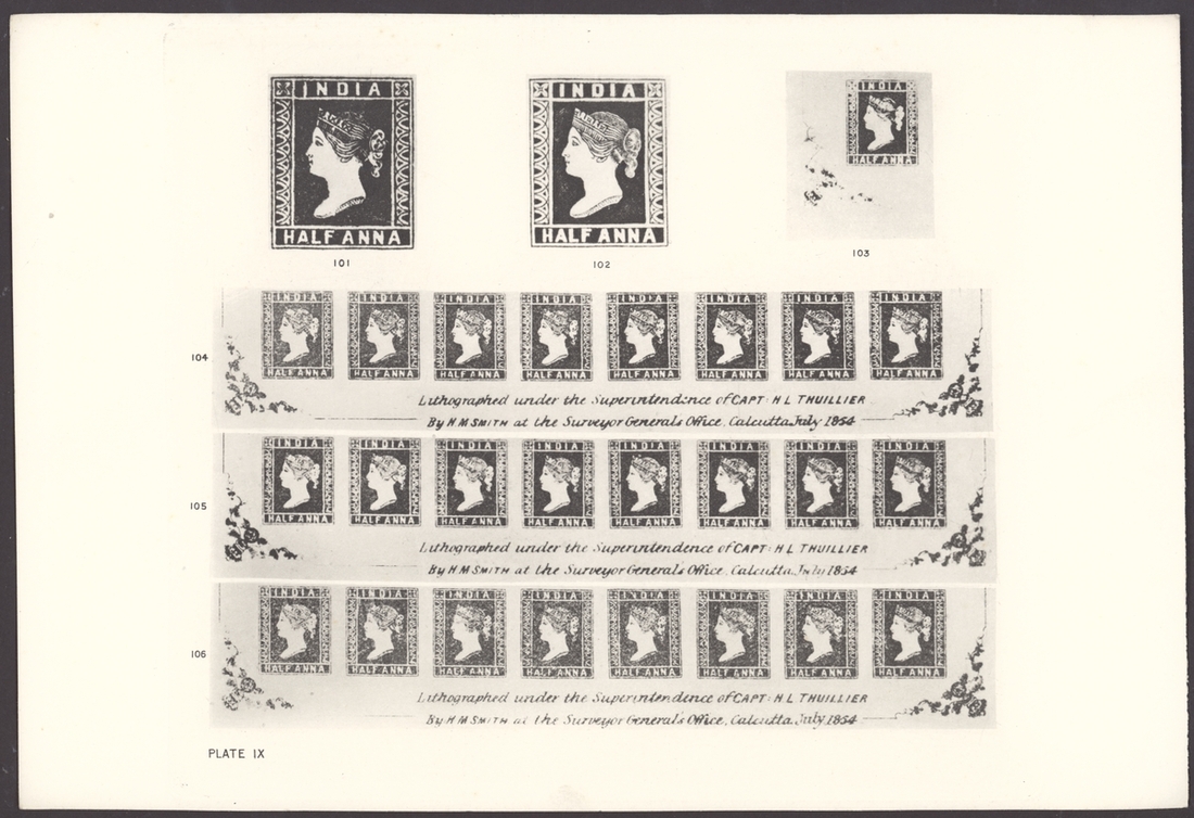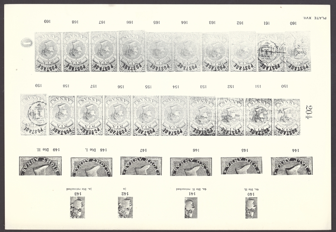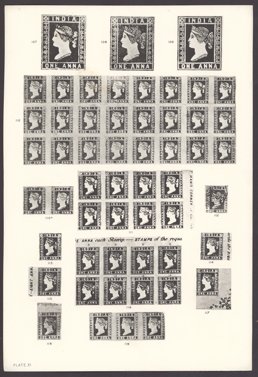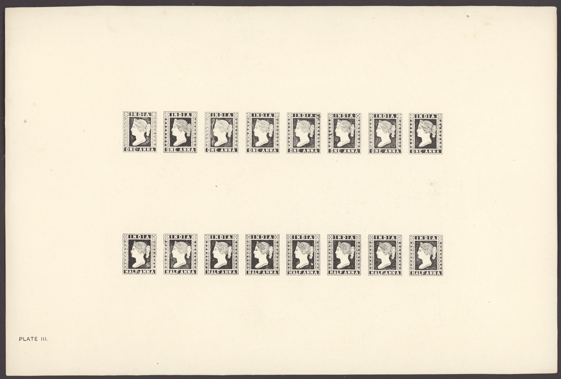 1905 the complete set of twenty three plates from the book "The Postage and Telegraph Stamps of British India" by L.L.R. Hausburg, C. Stewart-Wilson & C.F.S. Crofton, including the famous plates III and IV that were printed directly from the original copper plates; Plate III with ½a. and 1a. printed in black and each in a strip of eight and Plate IV with ½a., 2a. essays (both designs), 4a. and head all printed in black. Minor usual imperfections, a valuable, very difficult set to be found.