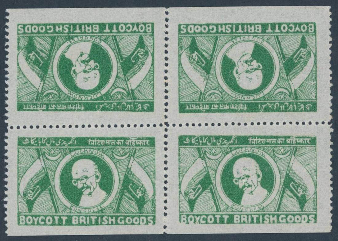 1911 Coronation Durbar, Central Post Office notice franked on reverse 1a. two pairs, strip of four and two blocks of four with Coronation Durbar cancellations of 3 Dec. 1911, also 148 (c.) green Gandhi "Boycott British Goods" labels, block of four containing two tete-beche pairs, unused without gum; fine