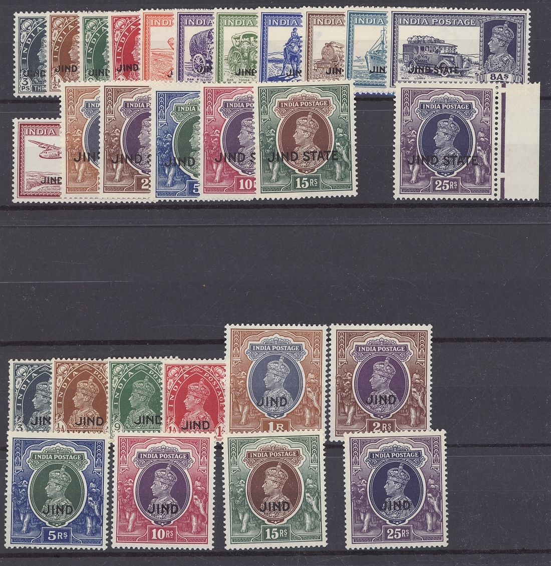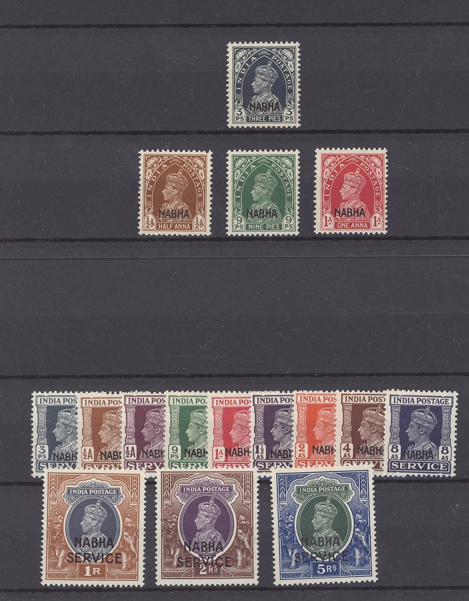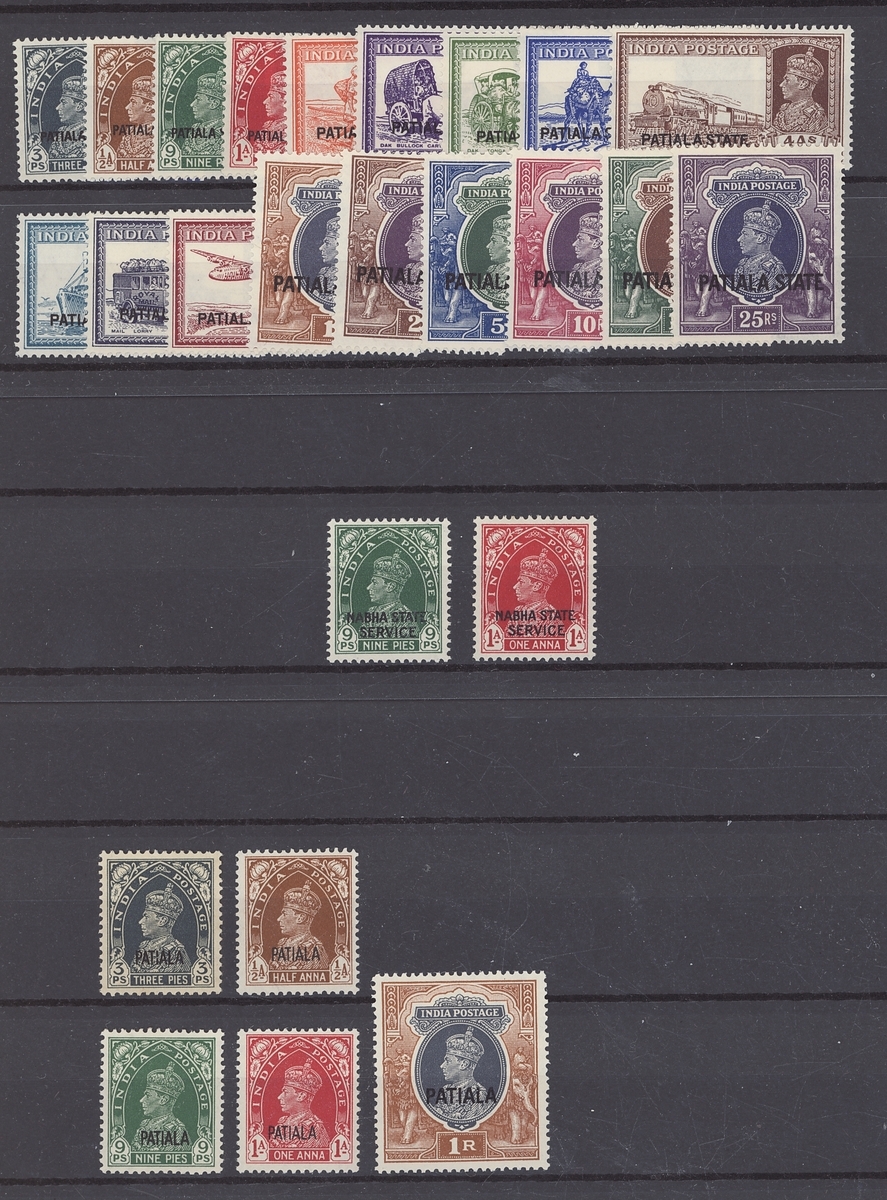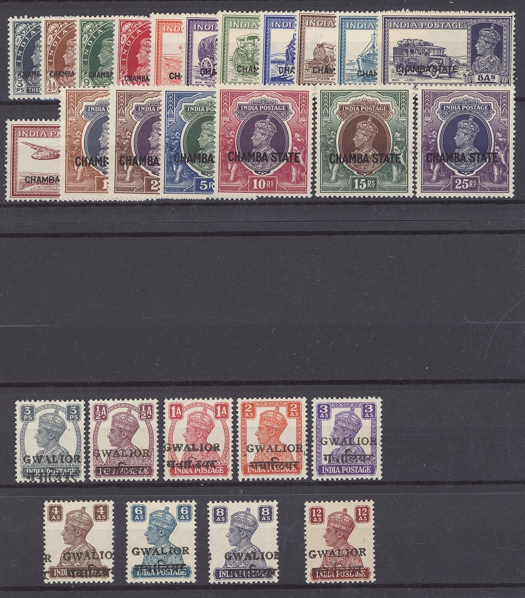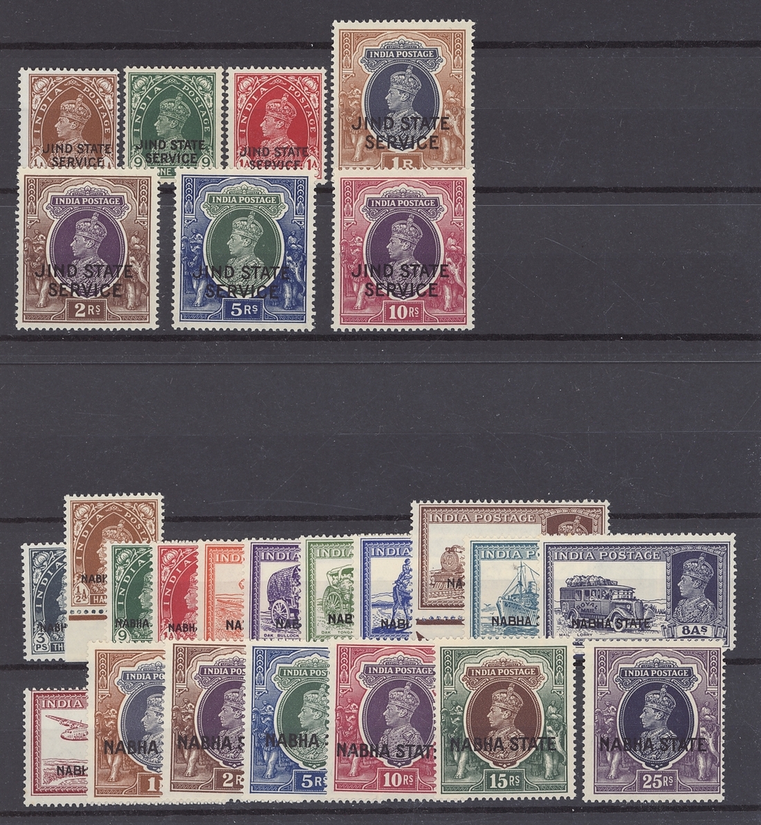 A group of mint sets from various states comprising Chamba with 1938 set to 25r., Gwalior 1949 set to 12a., Jind with 1937-38 set to 25r., 1941-43 'Jind' overprint set to 25r., 1937-40 'Service' set to 10r., Nabha with 1938 set to 25r., 1941-42 set of four to 1a., 1940-43 'Service' set to 5r., Patiala with 1937-38 set to 25r. and 1941-46 set of five to 1r.; good to fine mint. S.G. cat. value £5,800+