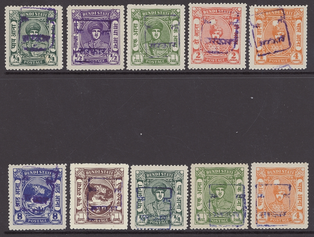 1948-49 handstamped in violet on stamps of Bundi ¼a. blue-green, ½a. violet, 1a. yellow-green, 2a. vermilion, 4a. orange, 8a. ultramarine and 1r. chocolate and handstamped in blue on stamps of Bundi ¼a. blue-green, 1a. yellow-green and 4a. orange; fine mint. S.G. 1B-7B, 1C, 3C, 5C, £1,400+