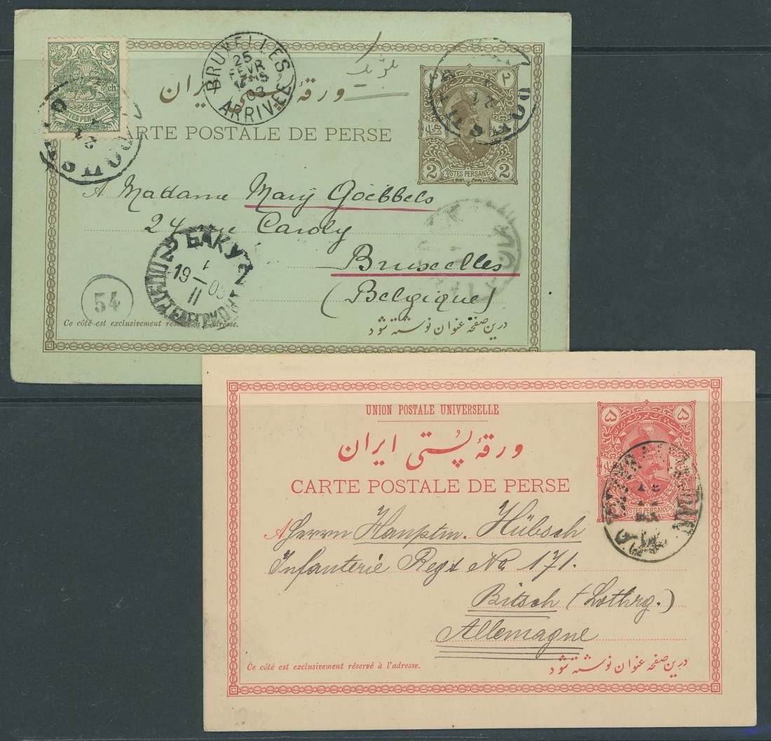 2ch. + 2ch. brown on green, uprated by 1894 2ch. and used from Bouchir to Belgium, reply portion attached and additionally 1ch and 2ch, cancelled but not used, 5ch. + 5ch. used to Germany with reply portion attached but not used; fine. Persiphila PC17-18. Photo