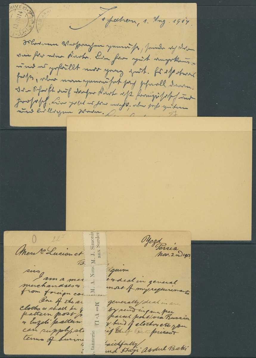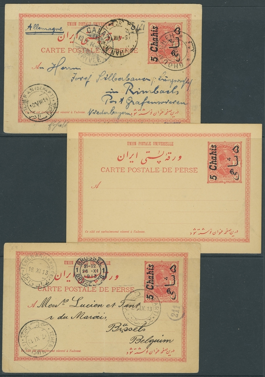 5ch. on 5ch. red, without picture, unused and used examples from Ghoumicheh to Belgium and Yezd to Germany; the unused card fine, the used creases or small tears. Scarce. Persiphila PC27