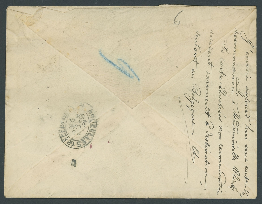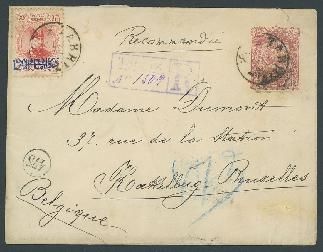 1902 Provisoire handstamp 12ch. rose-red, registered from Tabriz to Brussels and uprated by 1901-02 12ch. on 1kr. carmine red, oval arrival on reverse; a trifle soiled and creased. Rare. Persiphila PE9C. Photo