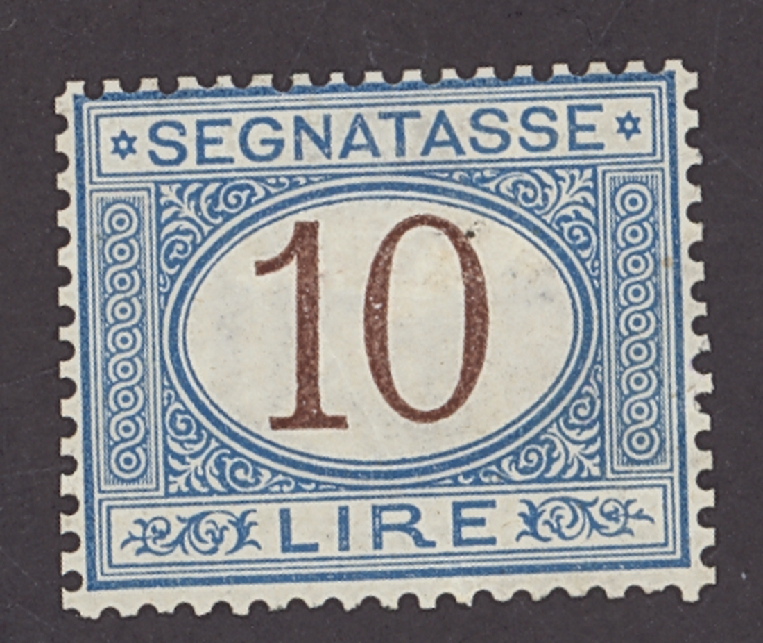 1874 10l. azure with brown digits, part original gum, very well centred for this issue. A light diagonal crease otherwise fine. A very rare stamp in mint condition. Signed Calves, Behr certificate (2016). Sassone 14, €19,000