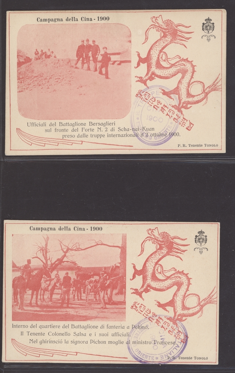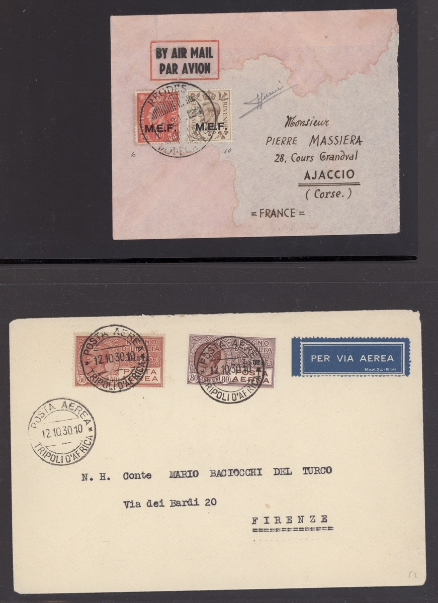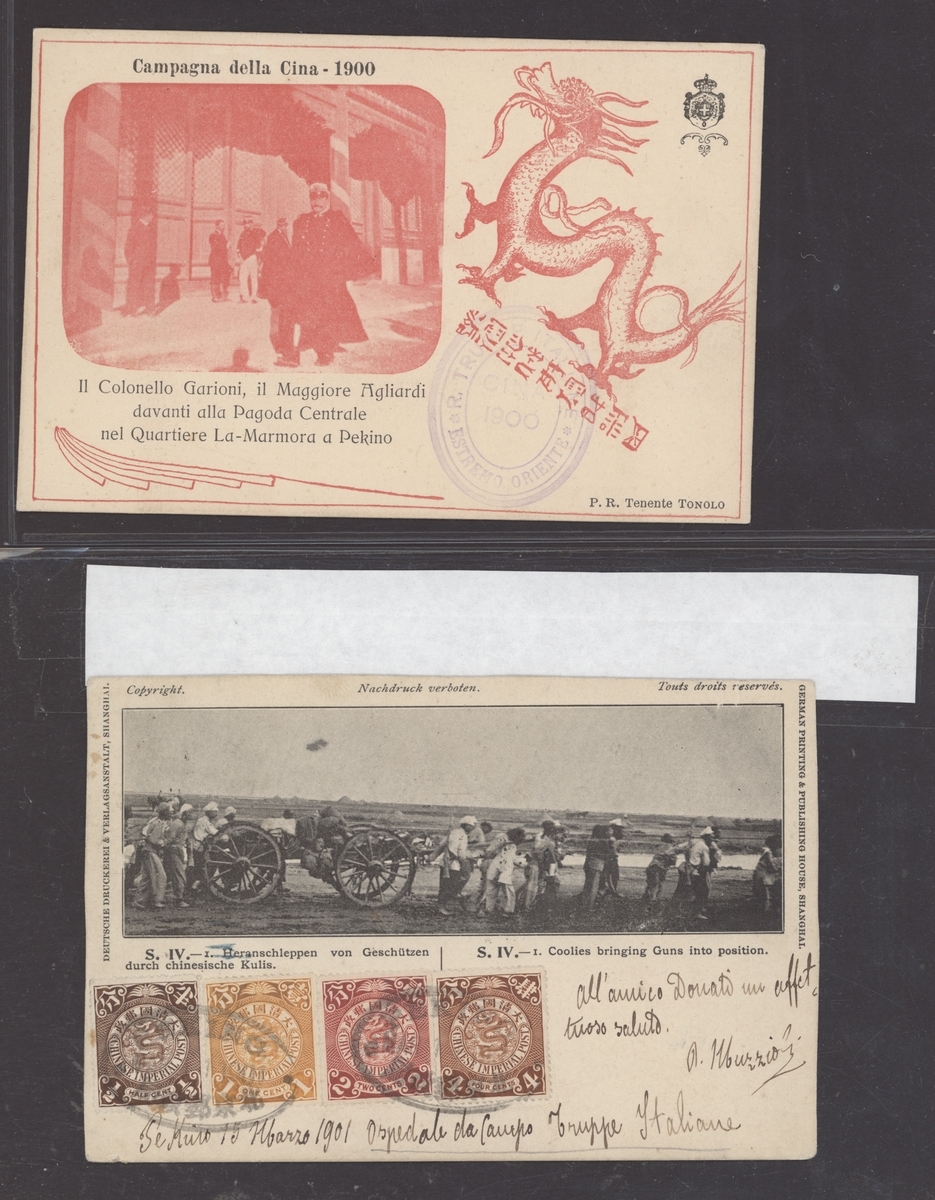 Postal history selection (7) including 1901 postcard marked 'Ospedale da Campo truppe Italiane' from Peking to Perugia franked on the picture side with China CIP ½c., 1c., 2c. and 4c. and on the address side with Hong Kong 2c. pair; three different unused postcards 'Campagna della Cina 1900', 1933 Zeppelin card to Munich; 1930 envelope from Tripoli to Florence bearing Italy air mail stamps 50c. and 80c.; also an envelope from Rhodes to Ajaccio bearing M.E.F. 1d. and 5d. with Sorani certificate. Mixed condition.