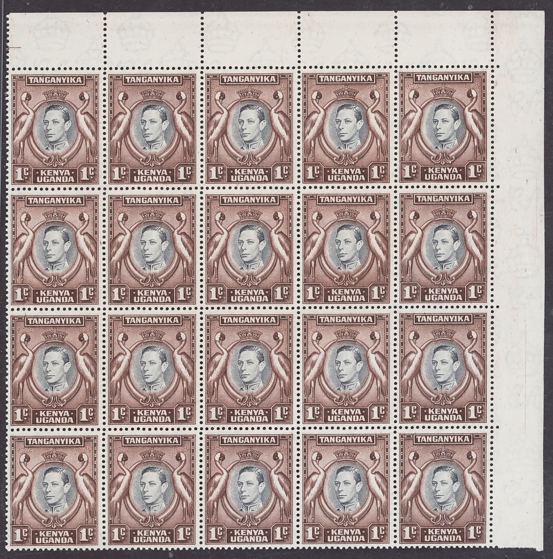 1938-43 1c. black and red-brown, block of twenty (5 x 4) from the upper right corner of the sheet, [R4/6] variety "A" of "CA" missing from watermark, unmounted mint; small coloured mark on one normal, fine. S.G. 131ab