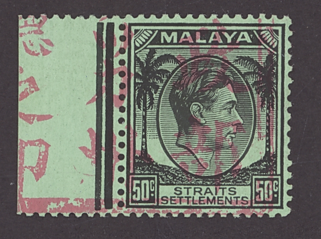 1942 (23 Apr.) 50c. black on emerald, marginal from the left of the sheet with large part chop in red; slightly toned gum as often found, fine. B.P.A. Certificate (1993). S.G. J54, £1,800