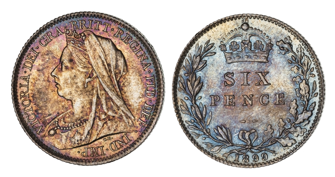 Victoria (1837-1901), 'Old Head' Sixpence, 1899, veiled head left, rev. crowned denomination within wreath, milled edges, 2.83g, 12h (ESC 1769; Bull 3292; S.3941), colourful toning throughout, residual cartwheel lustre, extremely fine