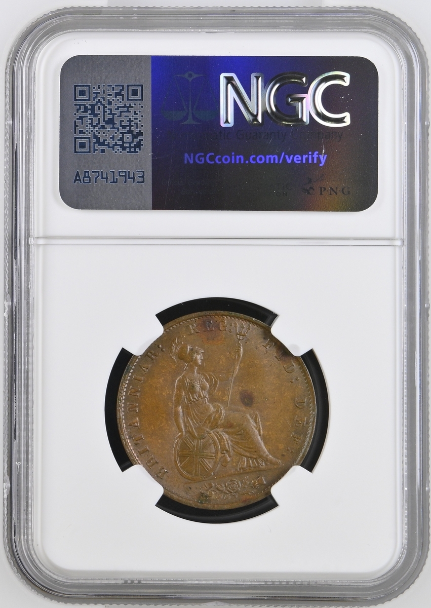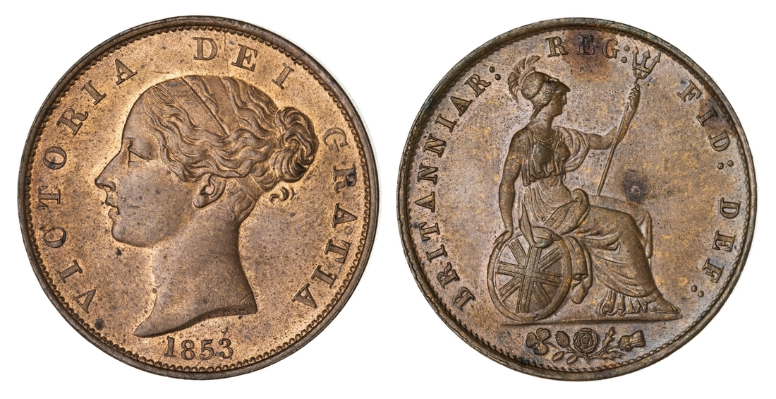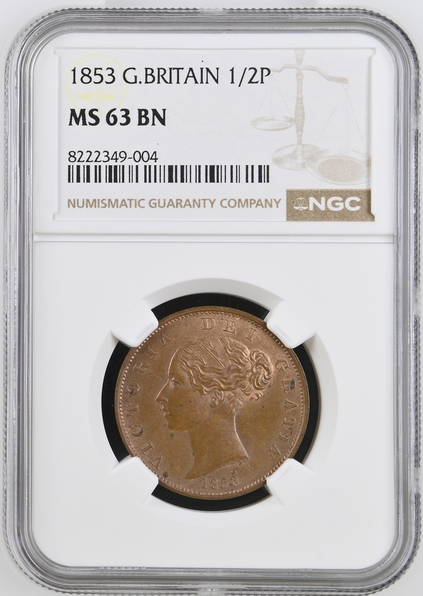 NGC MS63 BN | Victoria (1837-1901), Halfpenny, 1853, head left, rev. Britannia seated right, plain edge, 9.38g, 12h (BMC [Peck] 1539; S.3949), a couple of faint contact marks, with a handsome mint red lustre to obverse, good extremely fine, in NGC holder, graded MS63 BN (Cert. #8222349-004)