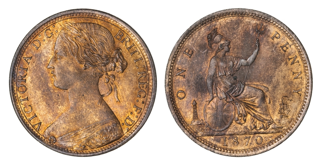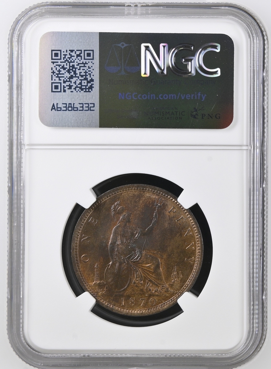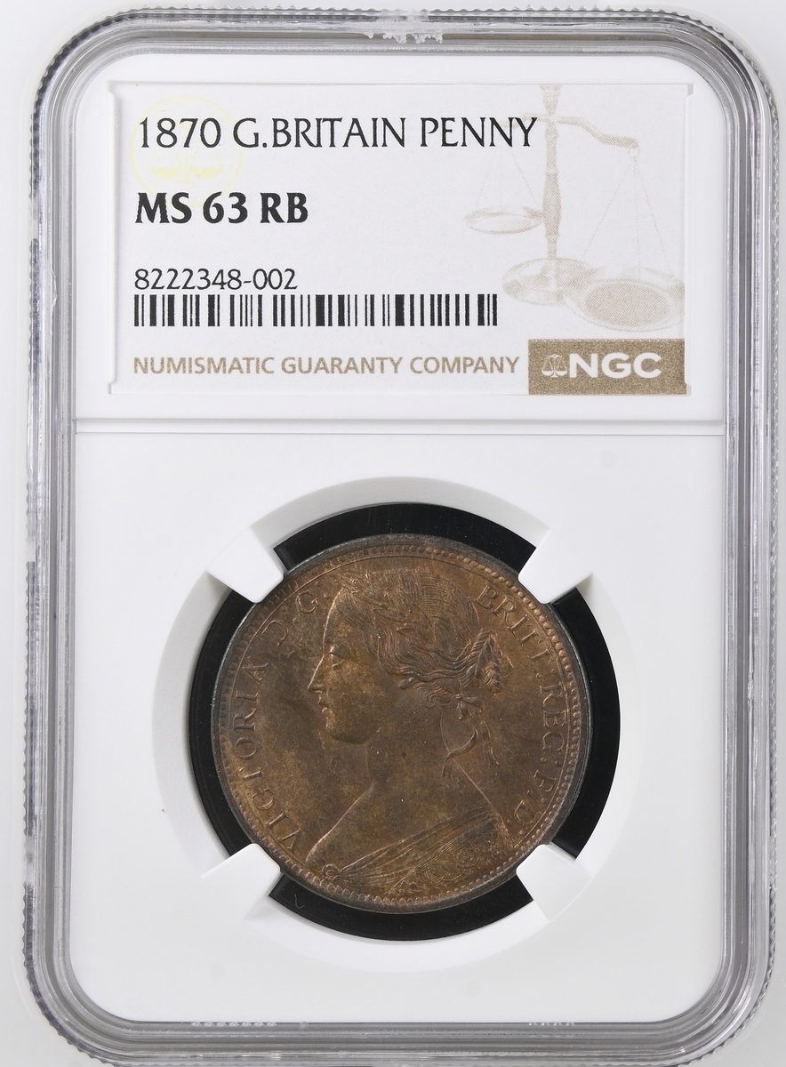 NGC MS63 RB | Victoria (1837-1901), 'Bun Head' Penny, 1870, young head left, rev. Britannia seated right, plain edge, 9.40g, 12h (BMC [Peck] 1686; S.3954), striated toning to otherwise red surfaces, about uncirculated, in NGC holder, graded MS63 RB (Cert. #8222348-002)