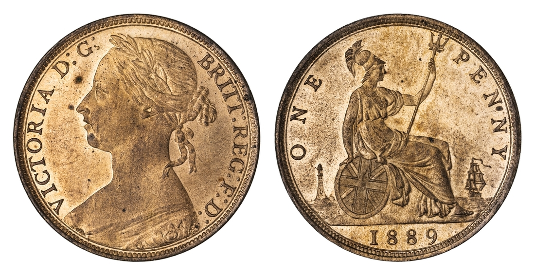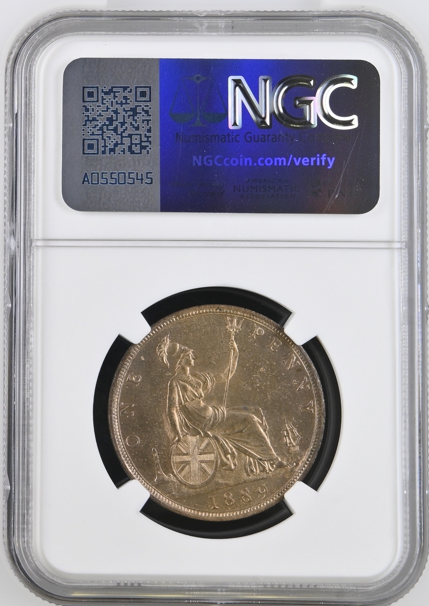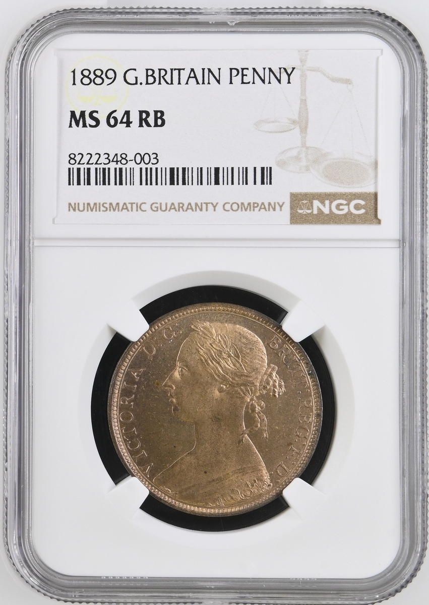NGC MS64 RB | Victoria (1837-1901), 'Bun Head' Penny, 1889, young head left, rev. Britannia seated right, plain edge, 9.26g, 11h (BMC [Peck] 1741; S.3954), some light friction marking, otherwise with handsomely flashy fields to red-brown surfaces, about uncirculated, in NGC holder, graded MS64 RB (Cert. #8222348-003)
