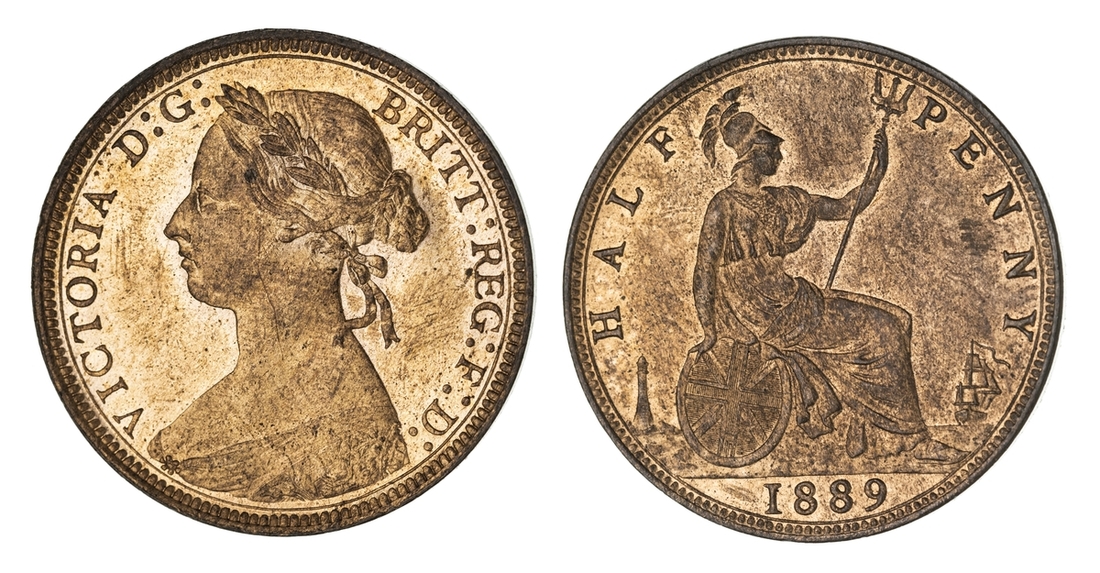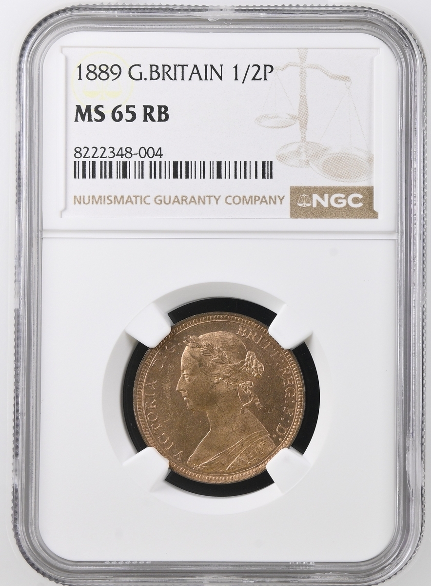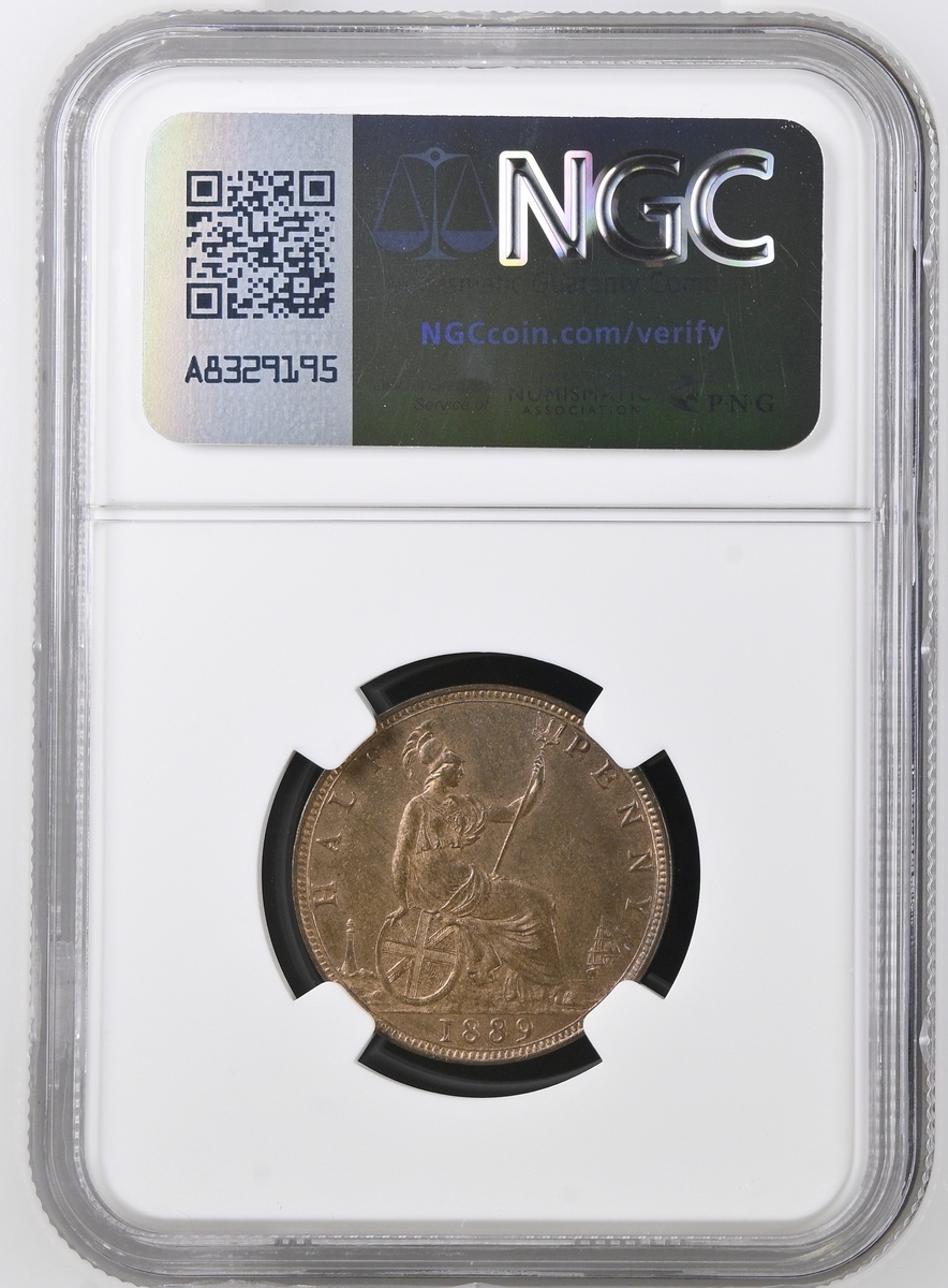NGC MS65 RB | *Top Pop* | Victoria (1837-1901), Halfpenny, 1889, bun head left, toothed border, rev. Britannia seated right, plain edge, 5.67g, 1h (BMC [Peck] 1845; S.3956), with a scattering of contact marks, otherwise with a handsome mint lustre to mostly red surfaces, uncirculated, in NGC holder, graded MS65 RB *Top Pop* (Cert. #8222348-004) [*Joint Finest Certified*]
