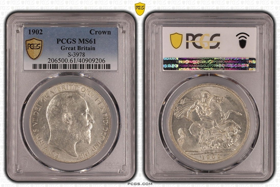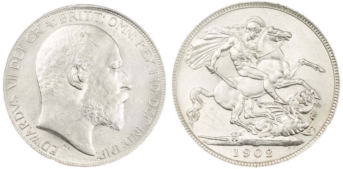 PCGS MS61 | Edward VII (1901-1910), Crown, 1902 II, bare head right, rev. St George and Dragon, edge lettered upwards, 12h (ESC 362; Bull 3562; S.3978), pinmarks and some light contact marks, including small edge knocks, otherwise residually lustrous, near extremely fine, in PCGS holder, graded MS61 (Cert. #40909206)