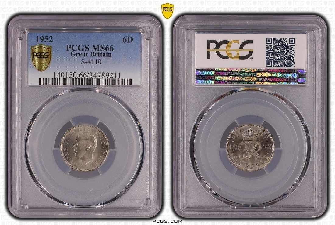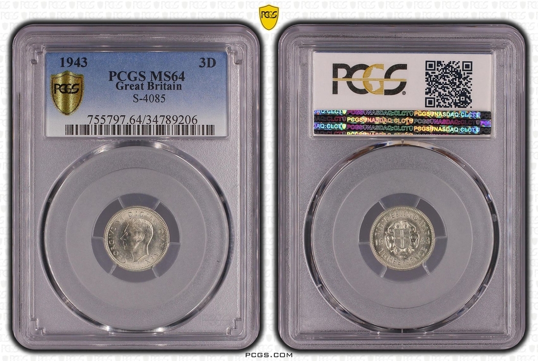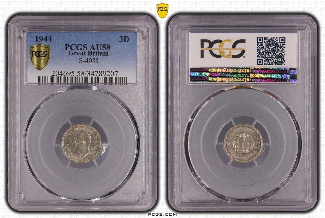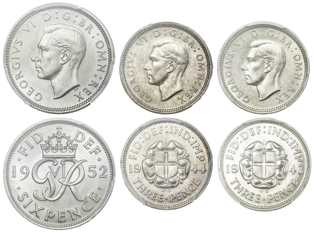 PCGS AU58-MS66 | George VI (1936-1952), Threepences (3), 1943, 1944, 1952, 12h (S.4085, 4110), all lustrous, good very fine to extremely fine, in PCGS holder, graded AU58-MS66 (Cert. #34789206, 34789207, 34789211) (3)