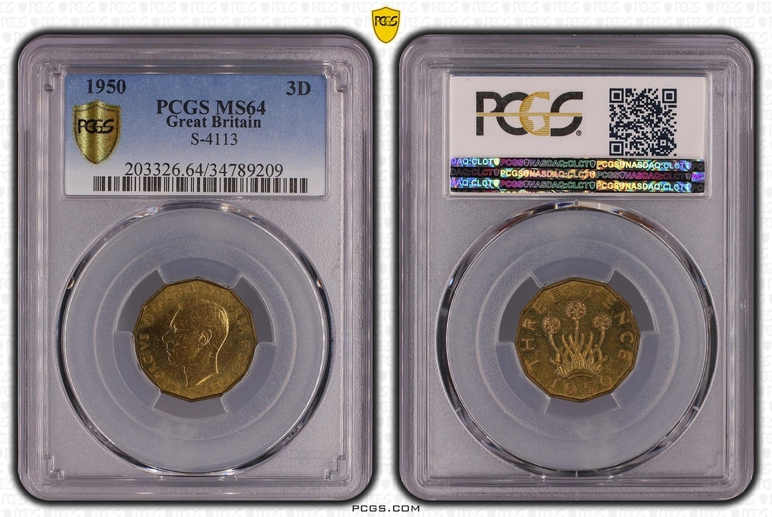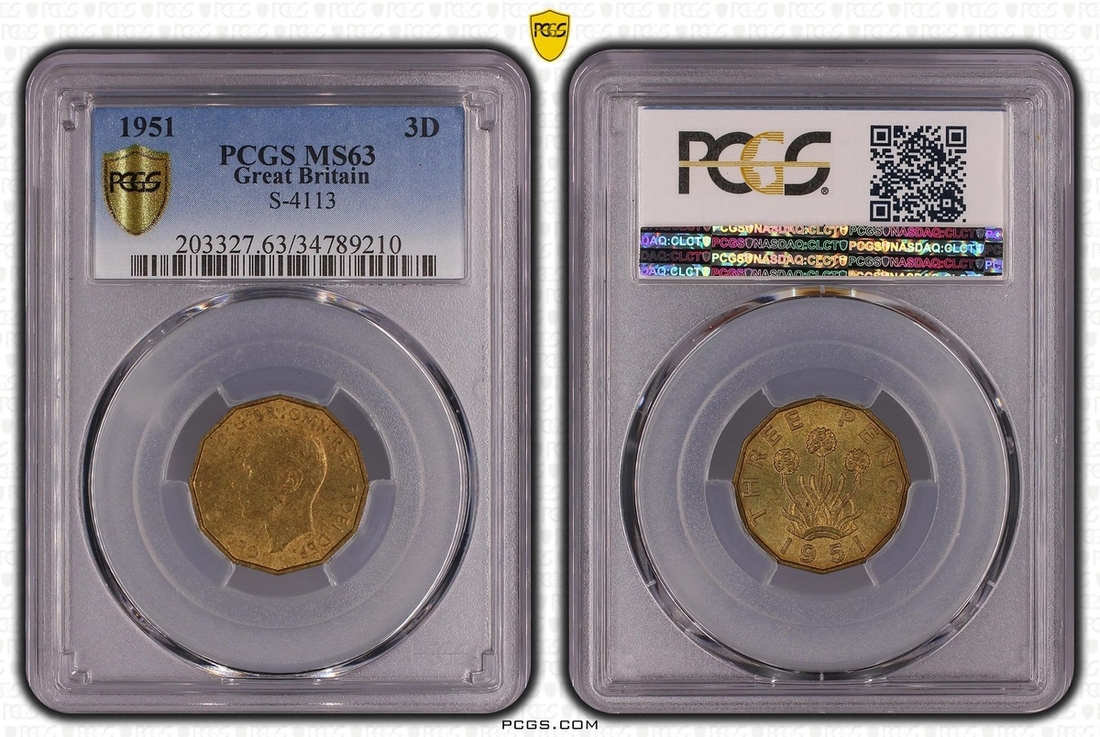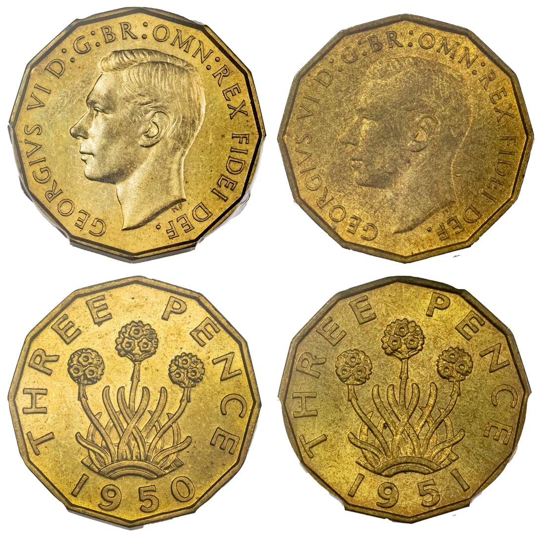 PCGS MS64 | George VI (1936-52), Brass Threepence, 1950, dodecagonal, bare head left, rev. thrift plant (S.4113), in PCGS holder, graded MS64 (Cert. #34789209); and another, 1951, similar (S.4113), in PCGS holder, graded MS63 (Cert. #34789210), both lustrous extremely fine (2)