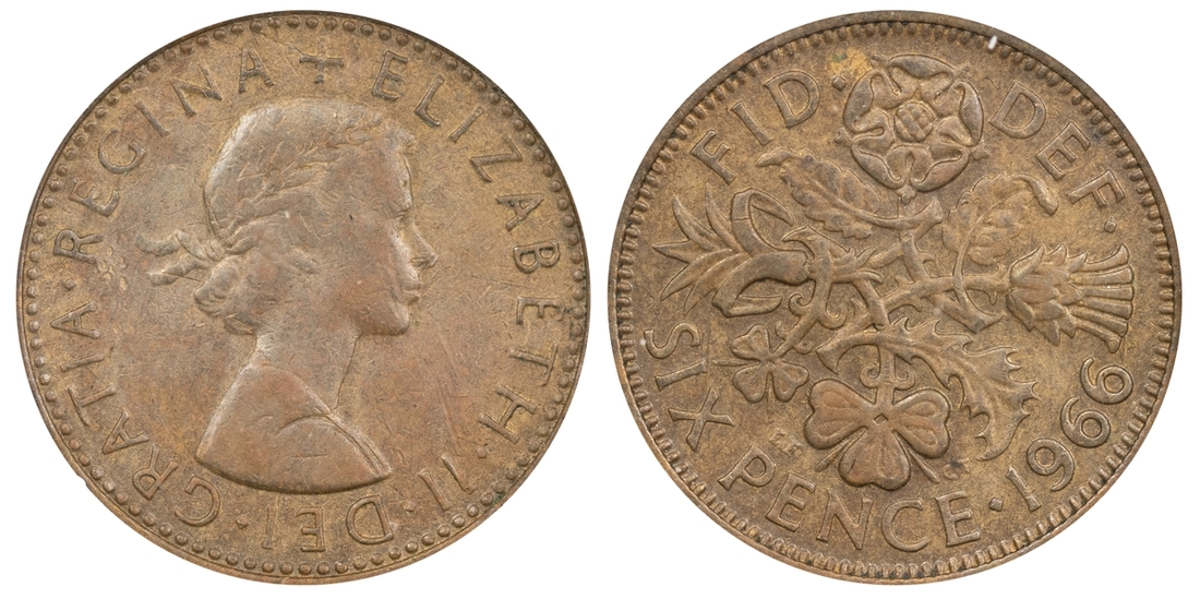 (x) Elizabeth II (1952-2022), Error 'Bronze' Sixpence, 1966, laureate bust right, rev. national emblems in cruciform, edge milled, 12h (cf. S.4149), some bagmarking, a most interesting modern off-metal striking, good very fine, presumed rare, in 'ICG' holder