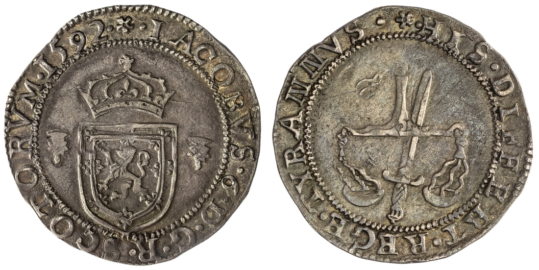 Scotland, James VI (1567-1625), Sixth Coinage, Balance Half-Merk, 1592, (m.m) • IACOBVS • 6 • D • G • R • SCOTORVM • 1592 •, crowned shield, dividing thistles, rev. (m.m.) • HIS • DIFFERT • RECE • TYRANNVS •, balance over sword, 4.30g, 3h, m.m. cinquefoil (S.5491), soft of strike to central devices, with a dark tone, very fine