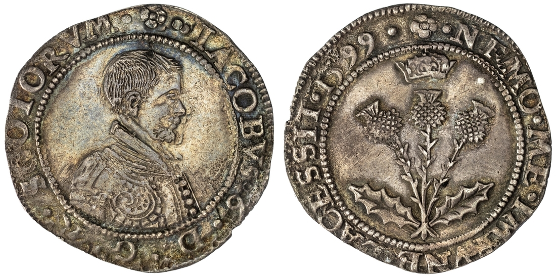 Scotland, James VI (1567-1625), Seventh Coinage, 10-Shillings, 1599, (m.m.) • IACOBVS • 6 • D • G • R • SCOTORVM •, bare-headed and armoured bust right, rev. (m.m.) • NEMO • ME • IMPVNE • LACESSIT • 1599 •, crowned triple-headed thistle, 5.38g, 11h, m.m. quatrefoil (S.5493), pitted to legends and some faint scratches to reverse periphery, portrait doubled, otherwise richly toned, about very fine