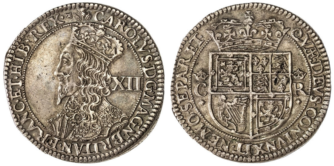 Scotland, Charles I (1625-1649), Falconer's Second, Issue, 12-Shillings, Type IV, crowned and draped bust left, slightly breaking inner circle and with falling lace collar, value behind, rev. crowned shield, dividing crowned C-R, 5.84g, 6h, i.m. F and thistle (S.5561), on a slightly irregular flan, reverse struck from slightly rusted dies, otherwise toned and some lustre to obverse field, near extremely fine