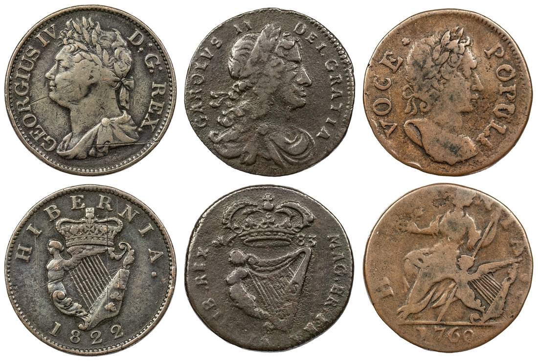 Ireland, Charles II (1660-1685), Armstrong and Legge's Regal Coinage, Halfpenny, 1683, edge milled, 7.43g, 1h (DF 358), bolder fine; Ireland, George III (1760-1820), Voce Populi, Copper Halfpenny, 1760, older laureate bust right, rev. Hibernia on harp, eight strings to harp, edge plain, 7.64g, 5h (DF 566), some metal stressing, light brown surfaces, bolder fine, over 1,250 struck; Ireland, George IV (1820-1830), Halfpenny, 1822, edge plain, 8.35g, 6h (DF633), scratched, fine (3)