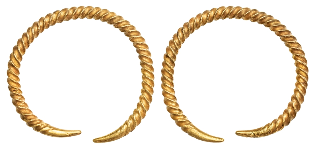 Bronze Age (First Millennium BC), Gold Coiled Ring Money, graduated hoop ring of cable pattern with finely tapered ends, diameter: 26mm, 3.59g [55.40grns], [Spink XRF: 80.97% Gold; 15.81% Silver; 3.21% Copper] (Mike Cuddeford, 'Ring Money - Fact or Fiction', BNS, 2018; cf. LaRiviere, Spink 2006, lot 1), likely used as a hair ornament, earring or as part of a bracelet or bangle, as well as being a store of wealth, of very fine workmanship