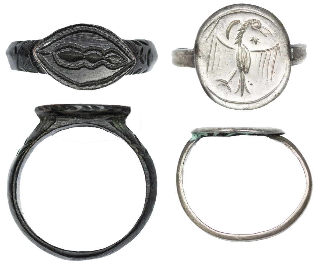 Medieval Finger Rings (2) | (c.1100-1300), Rings (2), including, Silver Finger Ring, with Spread Eagle Design, disc shaped bezel sat upon ring, eagle with head turned and wings splayed, crescent moon and star by neck suggesting potential links to the Crusades, 21.26mm, 2.67g [41.20grns], ring size approx. L 1/2 [Spink XRF: 92.43% Silver; 6.81% Copper; 0.76% Gold], some bright green corrosion to the reverse of the bezel, hidden when worn, an iconic motif, and a powerful statement for any wearer, very fine; and Bronze Amuletic Signet Ring, vesica or eye-shaped bezel upon ring, engraved with a beaded border and three ellipse forms, further decorative engraving on the shoulders, 24.5mm, 5.40g [83.33grns], ring size approx. V [Spink XRF: 79.9% Copper; 10.9% Lead; 6.66% Tin; 1.17% Antimony; 0.94% Nickel; 0.35% Iron], an impressive large size ring, extremely fine condition with very little wear, potentially intended to seal and authenticate letters and documents (2)
