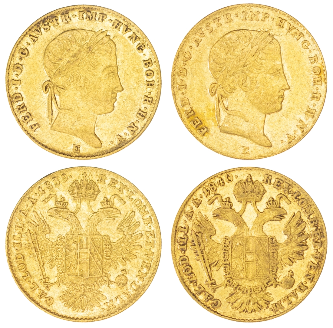 (g) Austrian Empire, Ferdinand I (1835-1848), Ducat, 1839 E, Alba Lulia, laureate bust right, rev. crowned imperial eagle, edge milled, 3.45g, 12h (KM 2262; Fb. 226), lightly contact marked and small stain in obverse legend, with a residual lustre, very fine; another, Ducat, 1840 E, Alba Lulia, edge milled, 3.44g, 12h (KM 2262; Fb. 226), light contact marking and some hairlines scratches to reverse, lustrous to reverse, very fine (2)